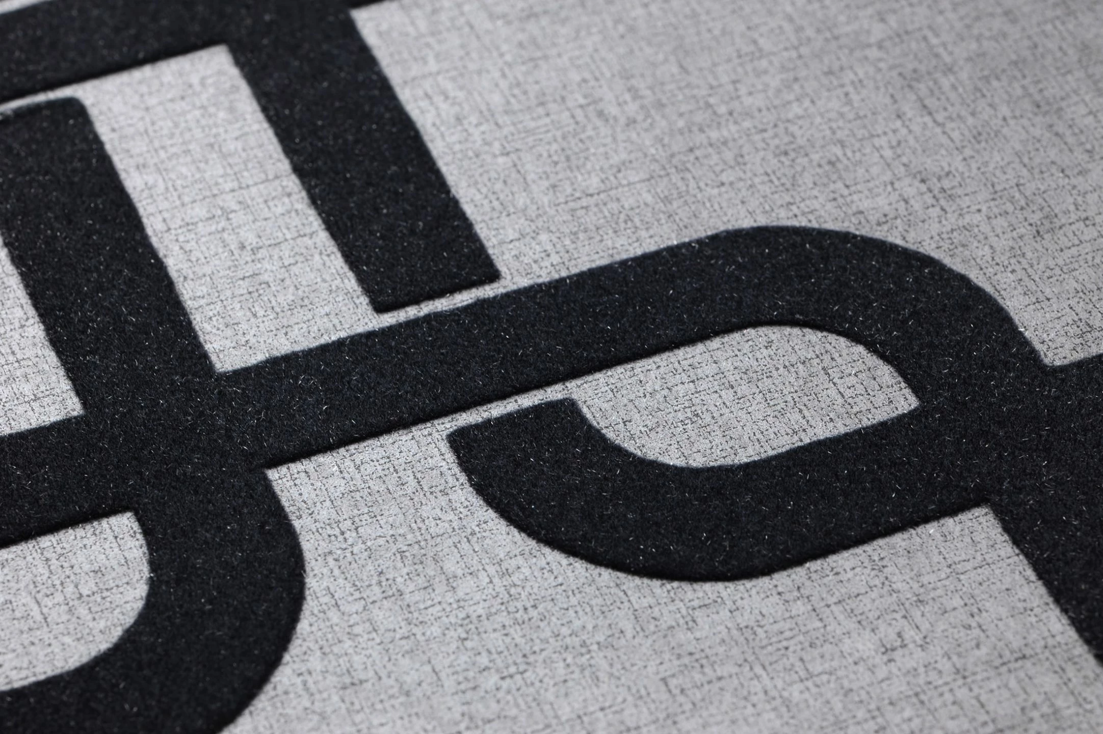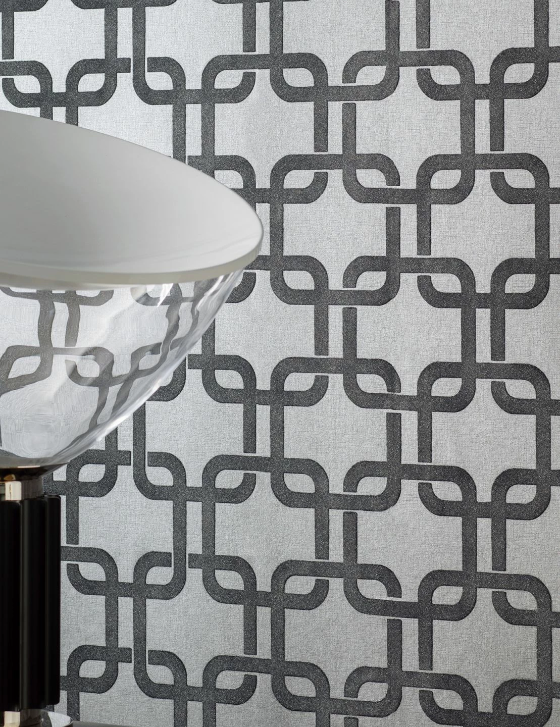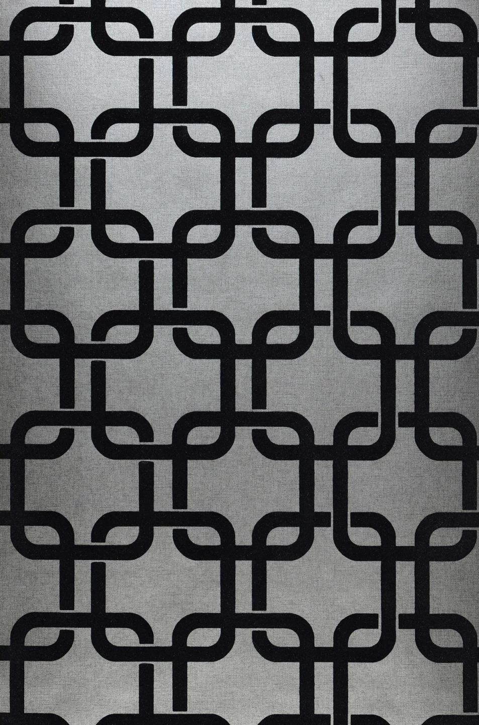 Spaciges Retro Design in Silbergrau und Schwarzgrau zum Anfassen schön – Die in sich verketteten Quadrate heben sich durch die Beflockung mit kurzen Textilfasern samtig weich vom schimmernden Untergrund ab. Das erzeugt nicht nur plastische Tiefe, sondern auch ein wohliges haptisches Gefühl. Genießen Sie Vintage-Charme mit allen Sinnen!