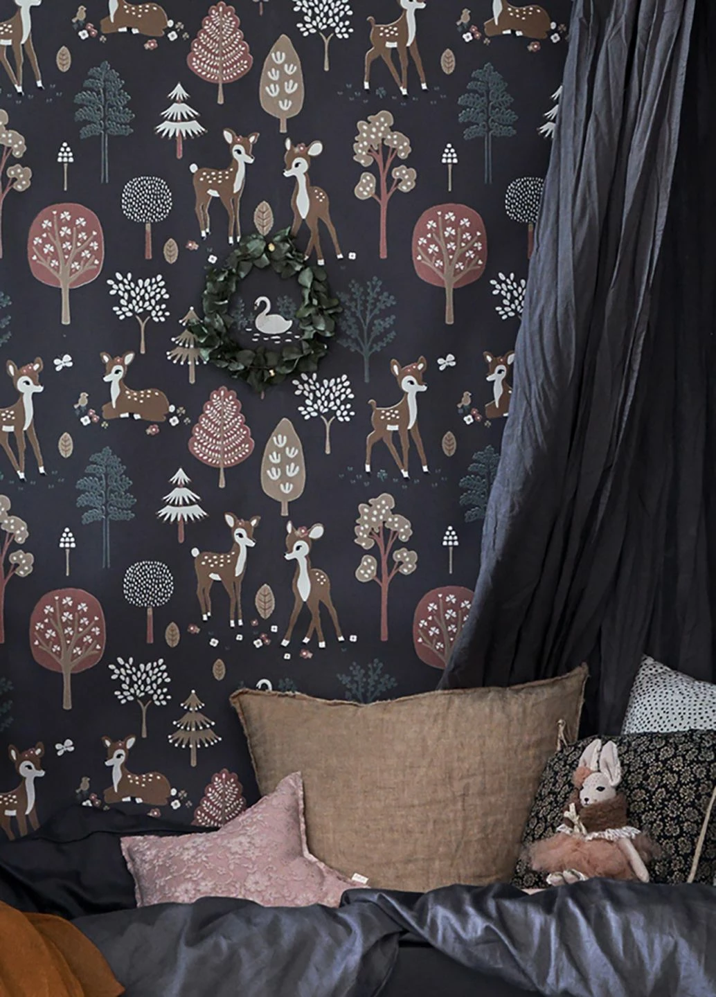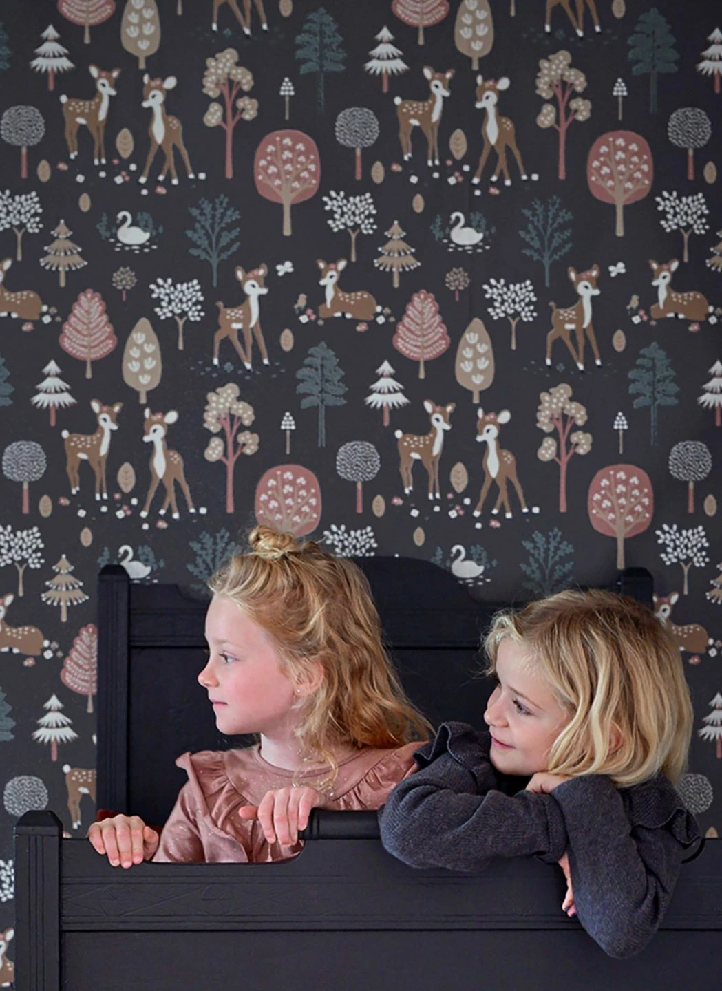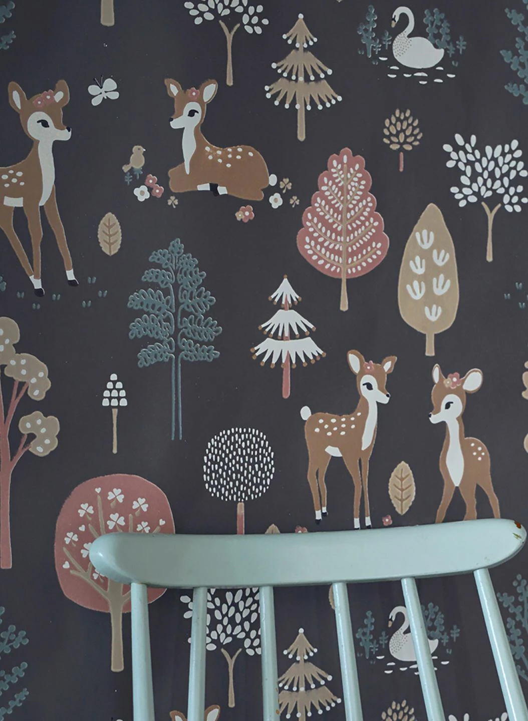Beim Anblick dieser idyllischen Waldszenerie kommen nicht nur Kinder ins Schwärmen. Der märchenhafte Mix aus stilisierten Laub- und Nadelbäumen, stolzen Schwänen sowie putzigen Rehkitzen erhält durch tiefgründiges Umbragrau eine spektakuläre Ausstrahlung. Die abwaschbare Vliestapete aus dem Hause Majvillan beruhigt auf wundervolle Art und Weise.