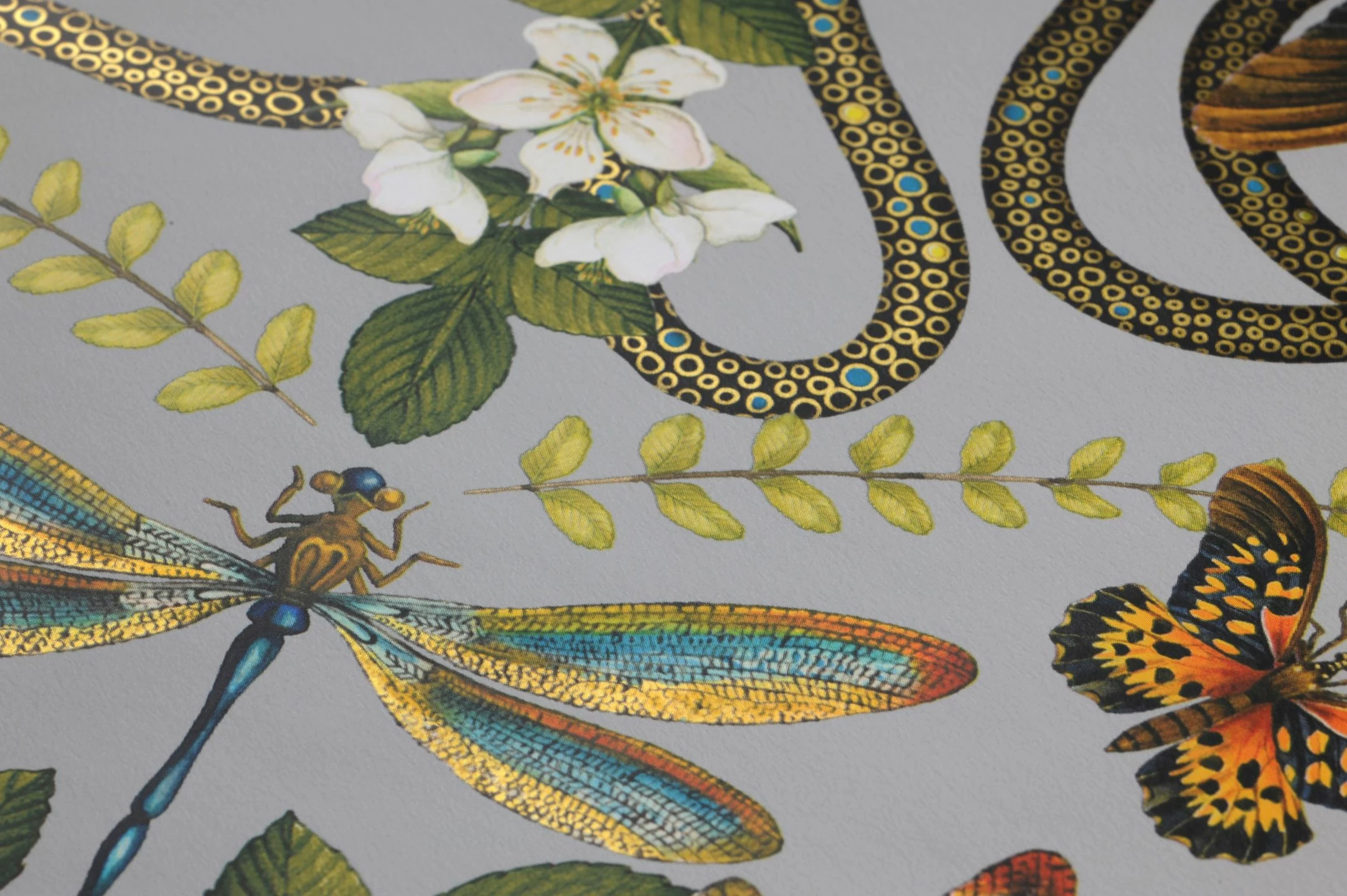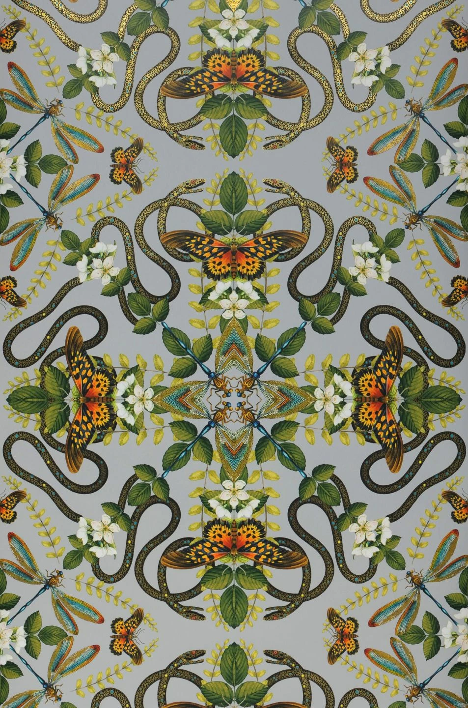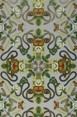 Die perfekte Symmetrie der Natur – die Zeichnung der Schmetterlingsflügel, die Anordnung der Blütenblätter und die Flügel der Libellen – trifft hier auf das symmetrische Arrangement der einzelnen Elemente des Musters. Schmetterlinge, Libellen, Blattranken, Blüten und Schlangen bilden ein mehrfach symmetrisches Ganzes wie beim Blick durch ein Kaleidoskop. Der hellgraue Untergrund lässt die schimmernden Musterfarben wunderbar zur Geltung kommen.