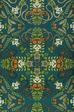 Wie beim Blick durch ein Kaleidoskop sind prachtvolle Schmetterlinge, sich ringelnde Schlangen und schlanke Libellen zusammen mit Blüten und Blättern zu einem faszinierenden Muster angeordnet. Die naturgetreue Darstellung der Einzelheiten eröffnet ein Spannungsfeld zu dem kunstvollen Arrangement. Der wasserblaue Grund strahlt Tiefe aus und bildet eine schöne Kulisse für die leicht schimmernden Musterfarben.