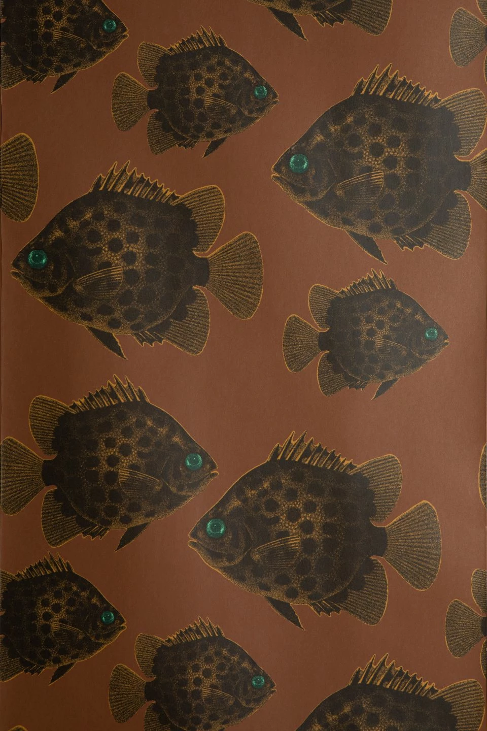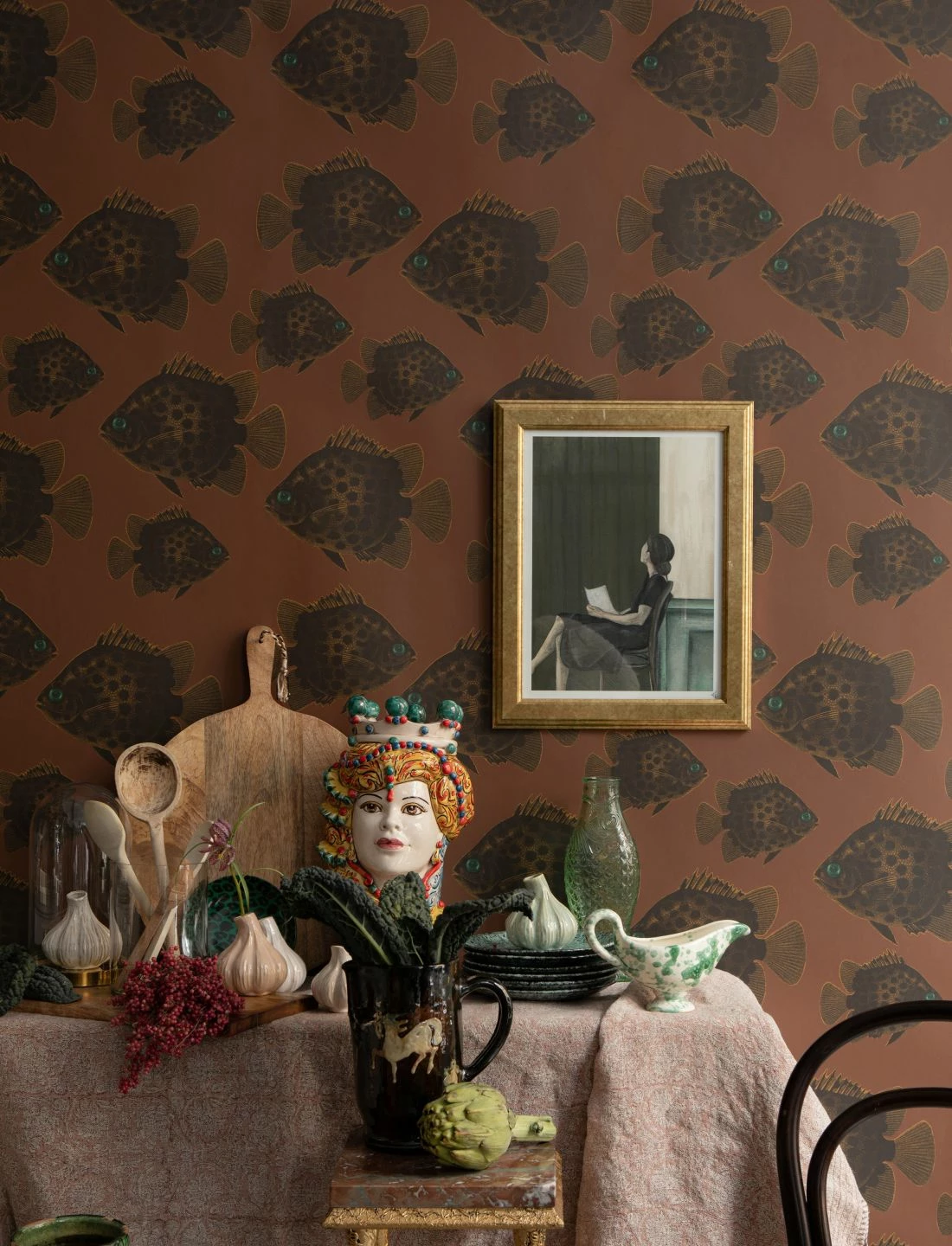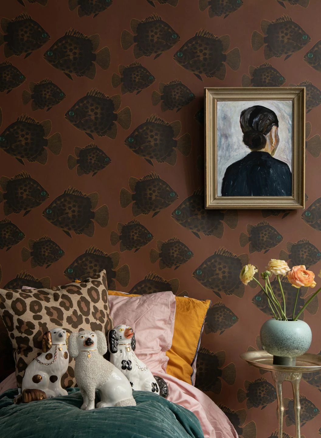 Das ausgefallene Design von Lisa Bengtsson konzentriert sich ganz auf warme, dunkle Brauntöne, die einen engen Zusammenhalt zwischen den Fischen des Musters und dem Untergrund herstellen. Dazwischen leuchten die grünen Augen der Fische hervor und lenken die Blicke auf sich. In der Balance zwischen Naturnähe und Stilisierung kreiert Vliestapete Hakan einen individuellen, gemütlichen Raum der Geborgenheit – nicht nur für Hobbyangler.