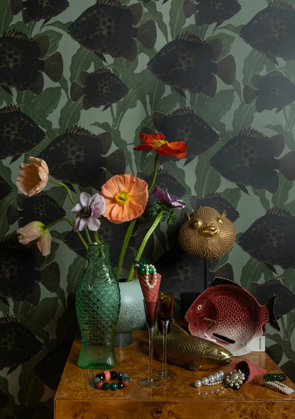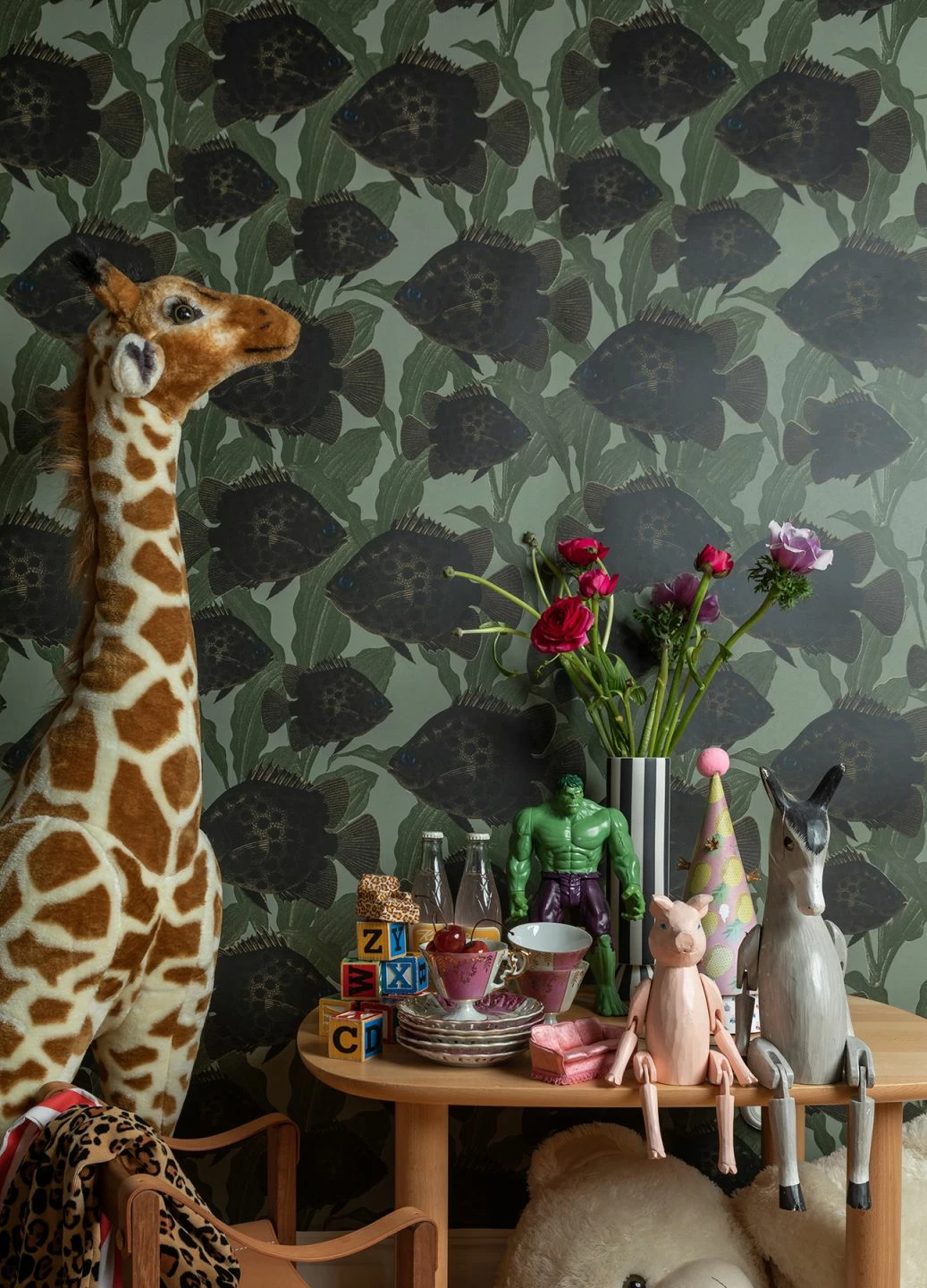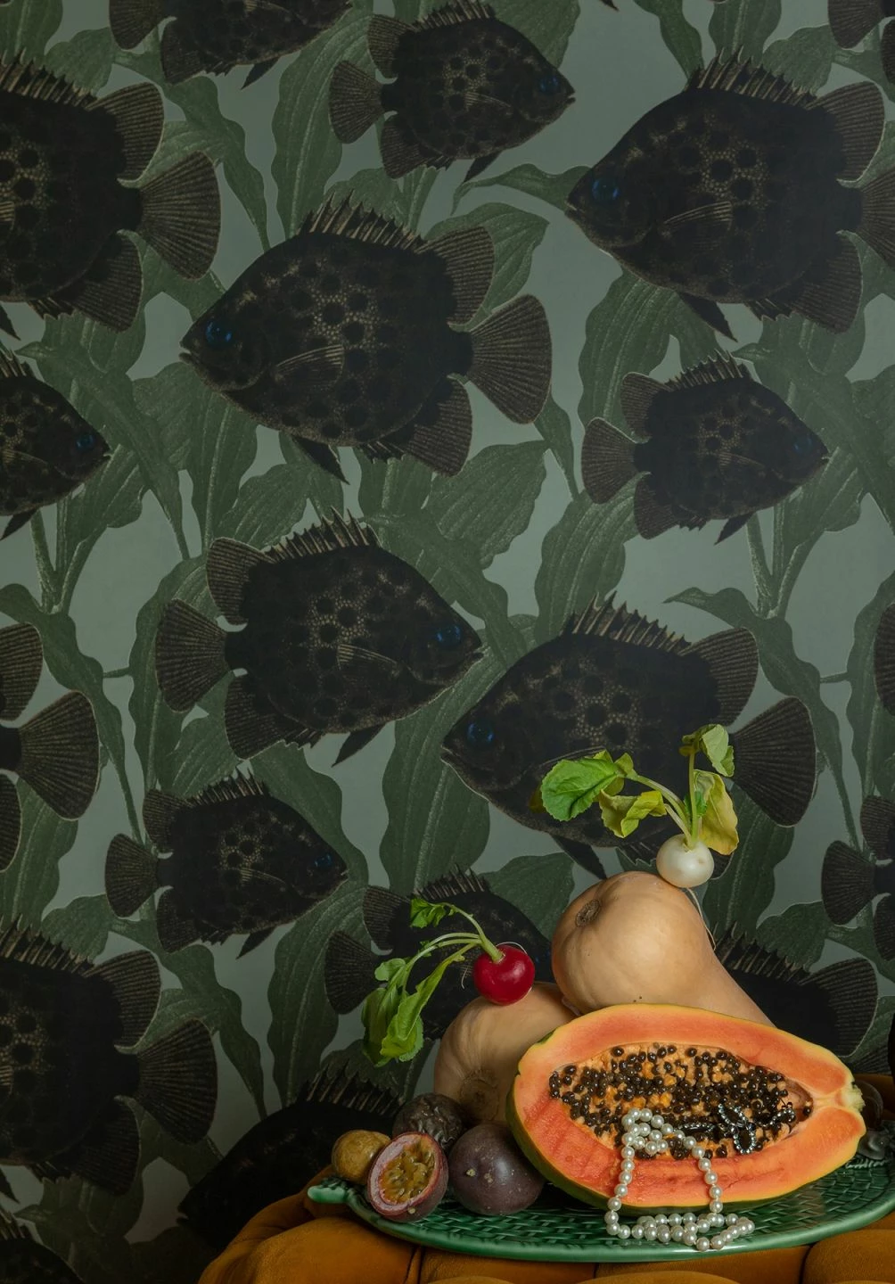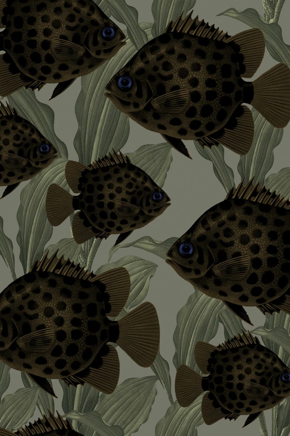 Die Vliestapete „Hakan“ nimmt Sie mit in die geheimnisvolle Welt unter Wasser. Die Fische in dunklen Farben und die blassgrünen Wasserpflanzen auf dem hellgraugrünen Untergrund sind detailgetreu dargestellt. Mit ihren intensiv blauen Augen scheinen sie den Betrachter anzublicken. Die gedeckten Farben erinnern an das gedämpfte Licht unterhalb der Wasseroberfläche und kreieren eine ruhige, gelassene Stimmung.