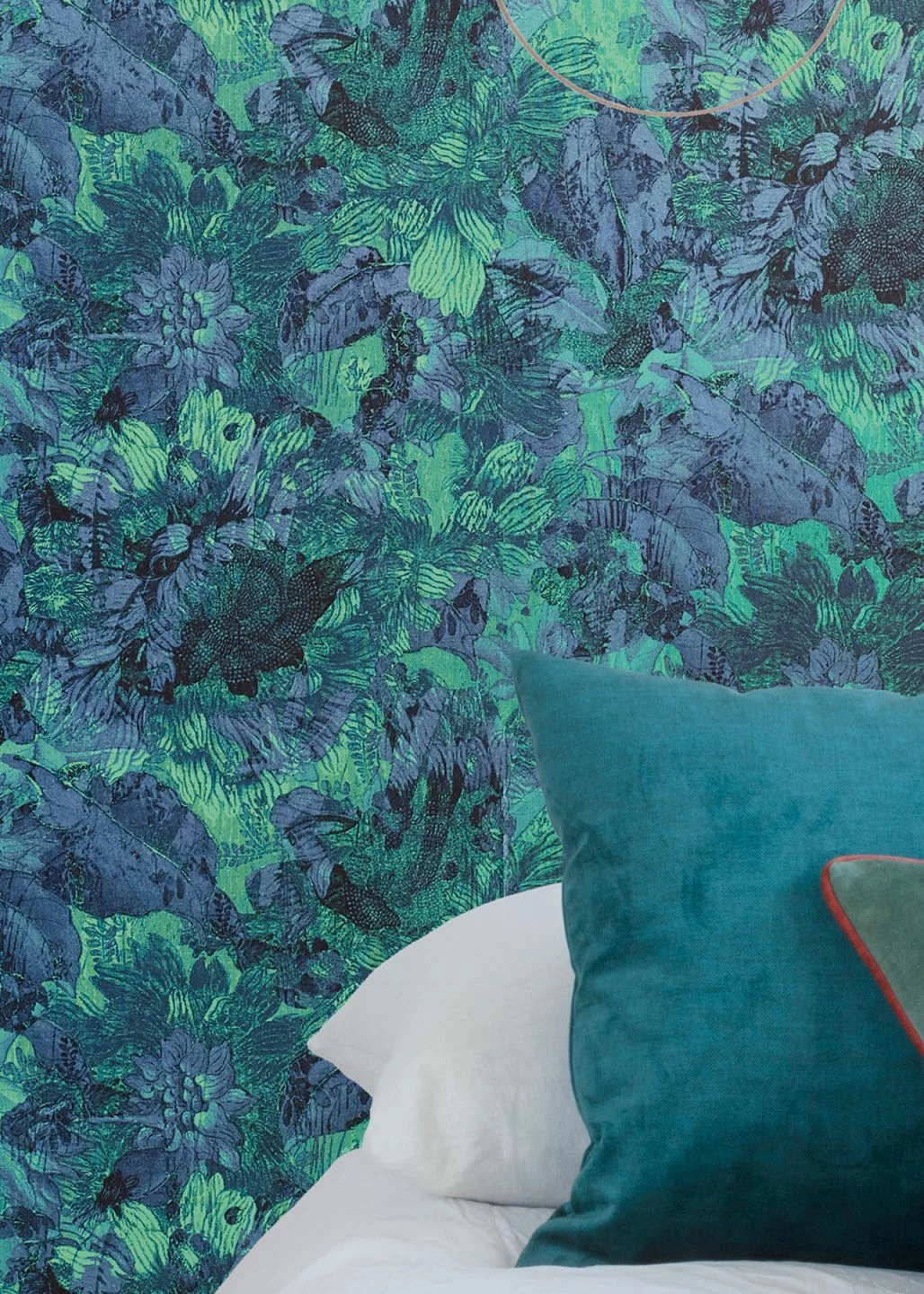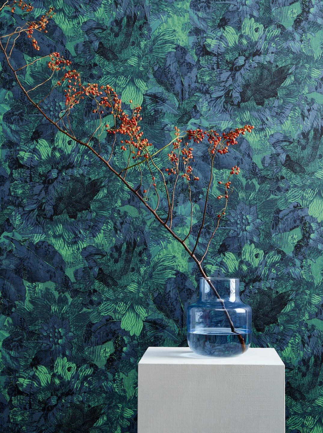 Mystische Tiefe entfaltet sich im Raum – Sonnenblumen und Blätter bilden die floralen Musterelemente der waschbeständigen Vliestapete mit glatter Oberfläche ab. Dicht und üppig wie in einem magischen Wald erscheinen die Gewächse durch die Farbgebung in Patinagrün, Perlblau und Schwarz. Vertrauen Sie Ihre kleinen Geheimnisse dieser grünen Oase an.