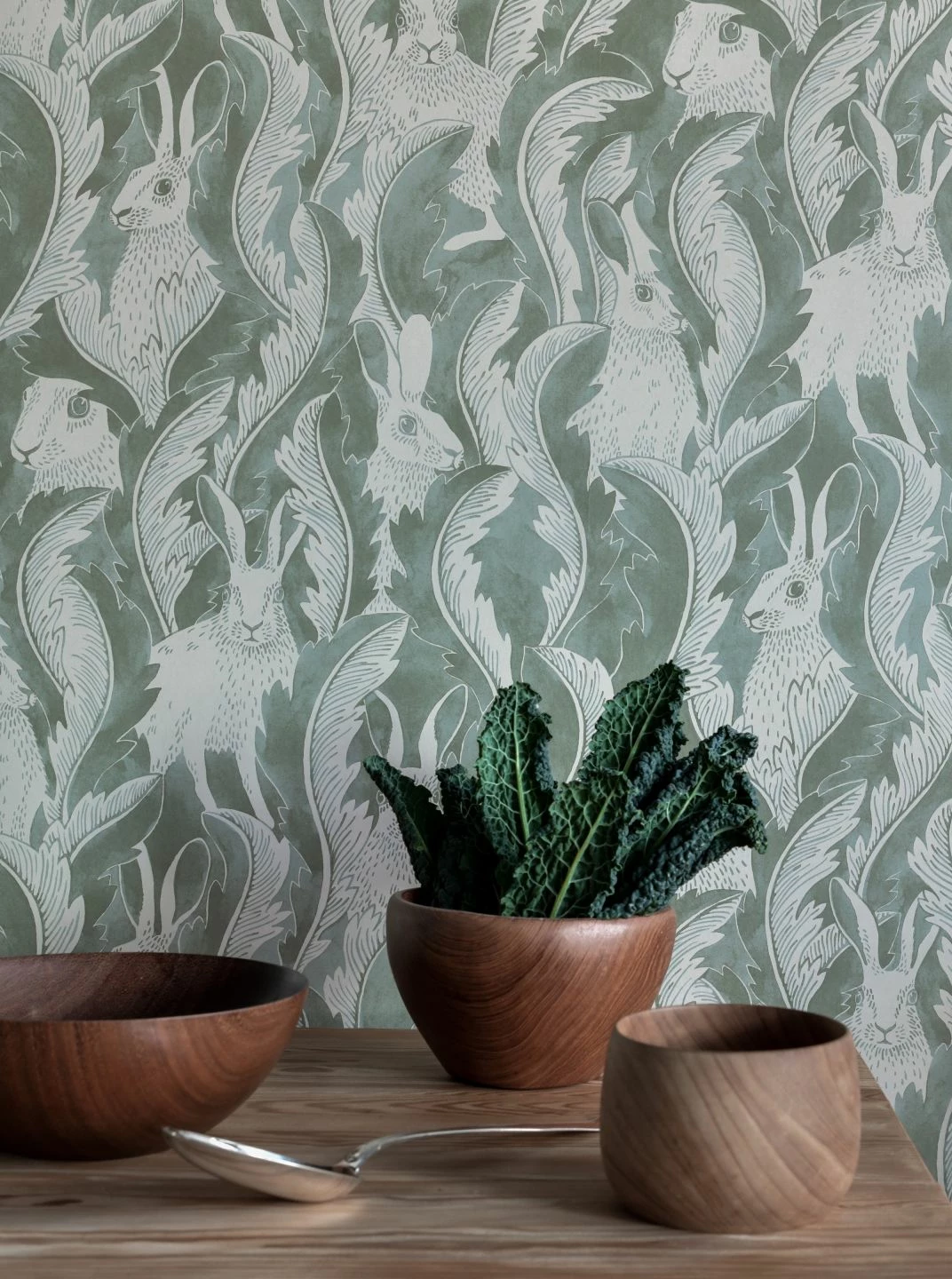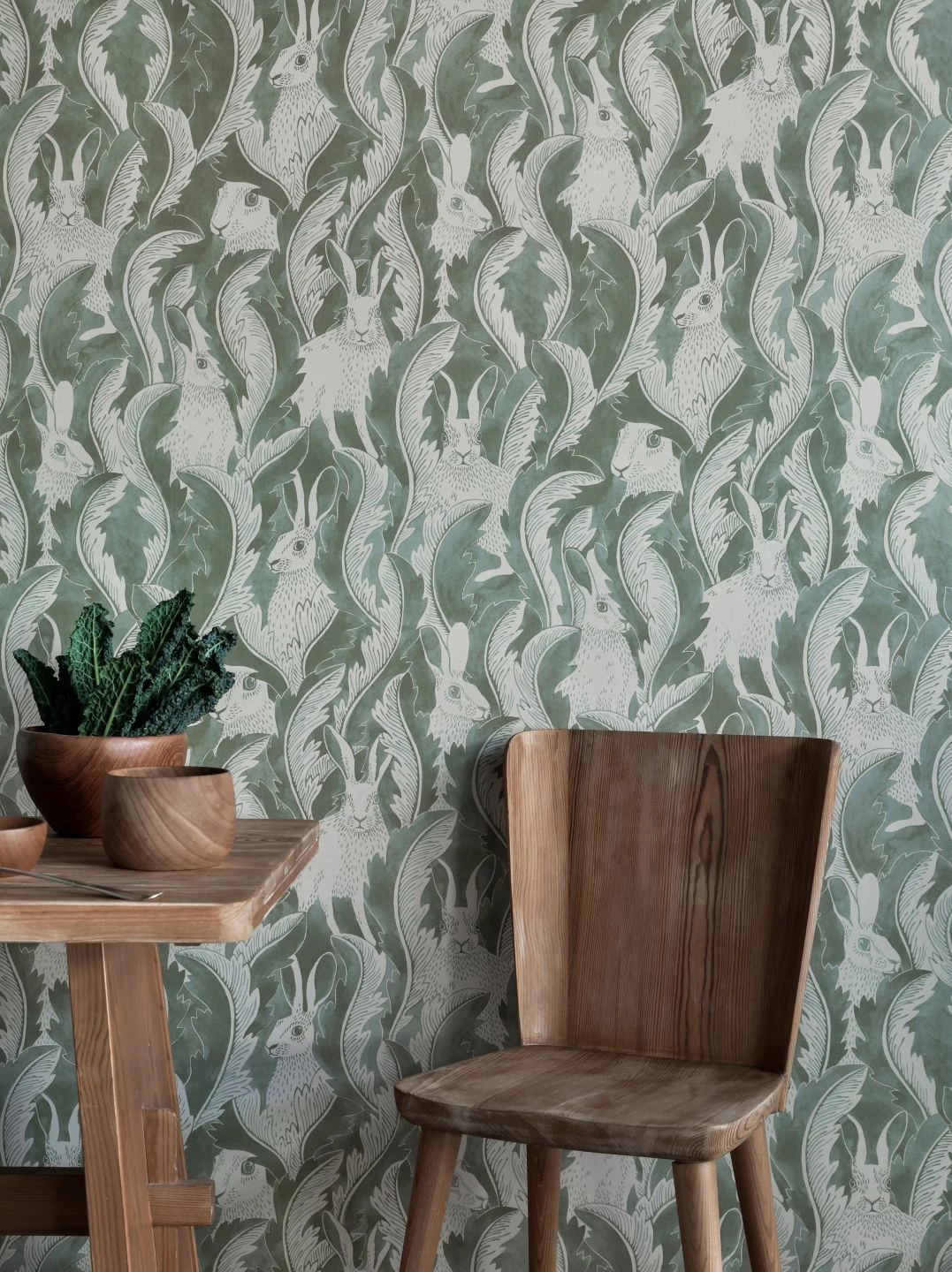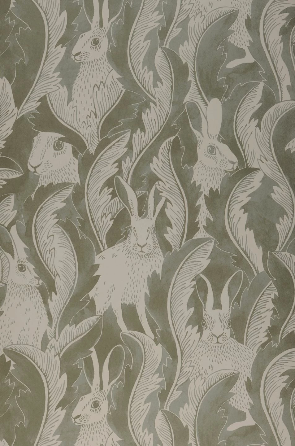 Wie in ihrem natürlichen Lebensraum sind die Feldhasen, die sich zwischen den überdimensionalen, geschwungenen Löwenzahnblättern mit ihren gezahnten Rändern verbergen, bestens getarnt. Im wellenförmig fließenden Muster entdeckt man sie erst, wenn man genauer hinsieht. Mit ihrem Schilfgrün belebt Hares in Hiding Ihren Raum dezent und doch individuell – perfekt zum Shabby Chic, Vintage oder zu skandinavischen Einrichtungselementen.
