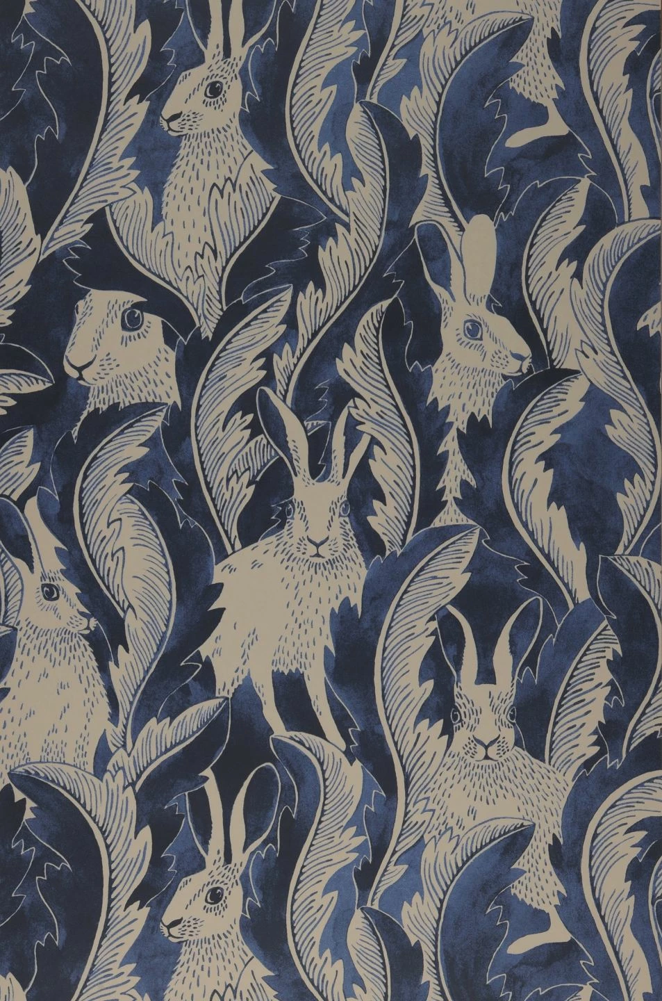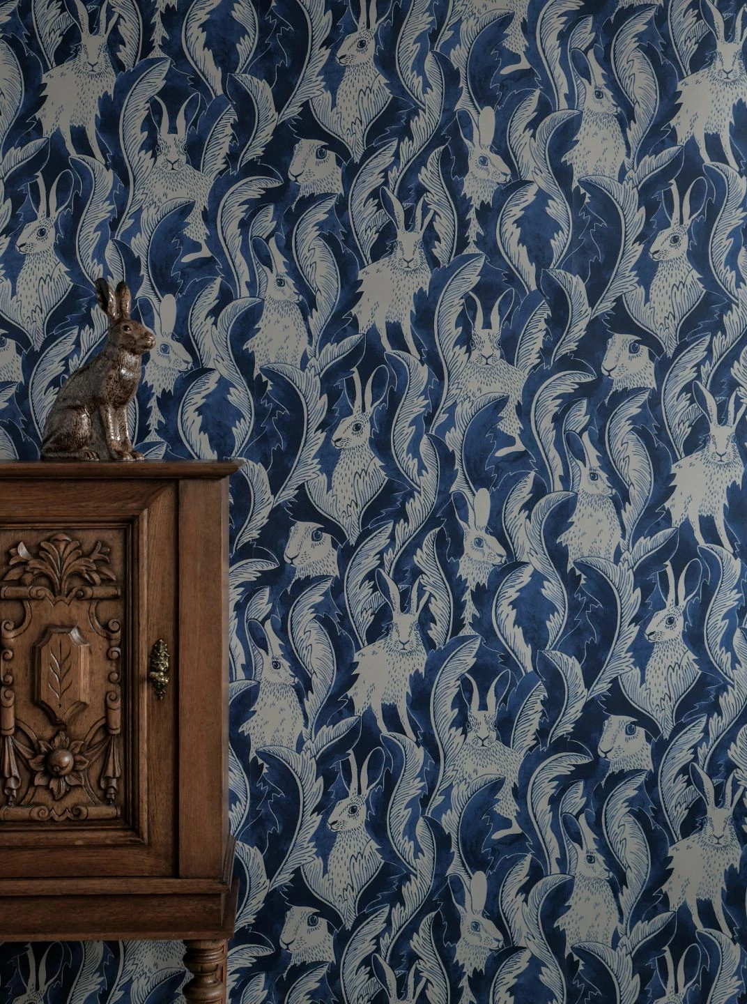 Alles andere als alltäglich ist die Wirkung, die Vliestapete Hares in Hiding ausübt. Das faszinierende Muster setzt sich aus Feldhasen mit ihren schlanken Köpfen und langen Ohren zusammen, die sich zwischen überdimensionalen stilisierten Löwenzahnblättern verbergen. Die klaren, dunklen Blautöne und das Hellelfenbein ergeben zusammen eine wirkungsvolle Farbgestaltung für einen außergewöhnlichen Raumeindruck.