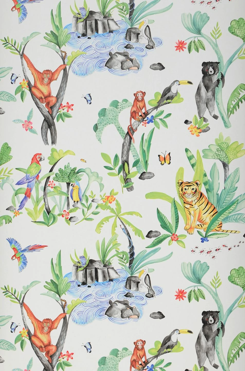 Ein Kinderzimmer wie ein ganzer Zoo voller exotischer Tiere, die den Betrachter freundlich anblicken – welches Kind würde sich darin nicht pudelwohl fühlen? Viel zu entdecken gibt es in den farbenfrohen, wie mit Wasserfarbe gemalten kleinen Szenen auf dieser Papiertapete: Da taucht ein Nilpferd aus dem Wasser auf, ein Orang-Utan hangelt zwischen zwei Baumstämmen, dazwischen Papageien, Insekten und exotische Pflanzen.