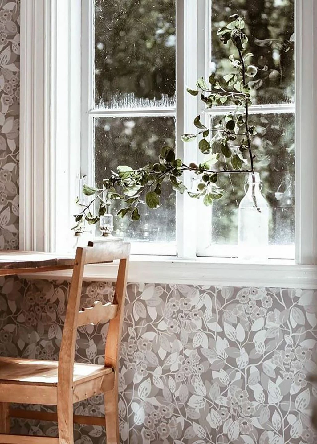Ihre außergewöhnliche Farbgebung macht den besonderen Charakter dieser Vliestapete aus: Graubeige, grauweiß und hellgrau auf einem grauen Hintergrund sind die Blätter und Blüten, die sie über und über bedecken. Durch die Farbgebung rein aus verschiedenen Schattierungen von Grau wirkt das florale Muster wie eine kostbare, künstlerische Schwarzweißaufnahme. In Verbindung mit Weiß, aber auch mit schwarzen Einrichtungselementen entfaltet es seine ganze Eleganz.