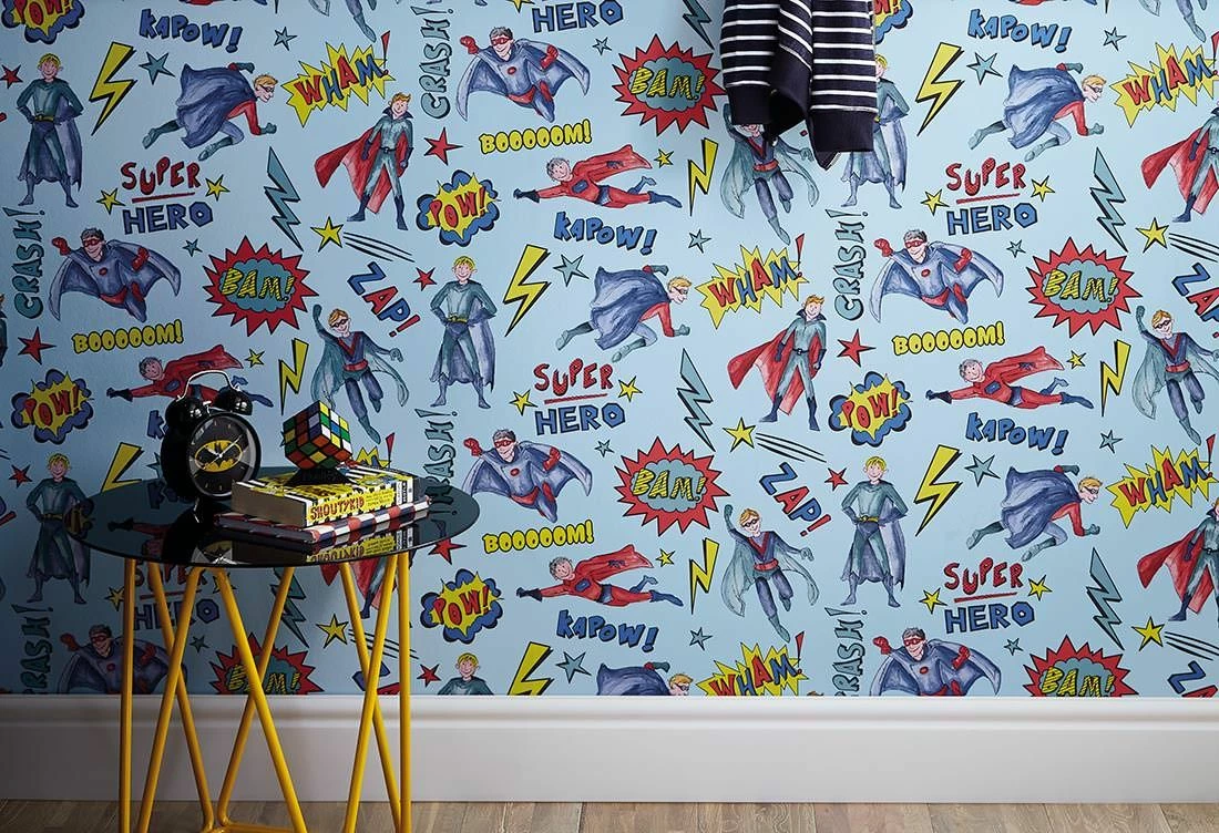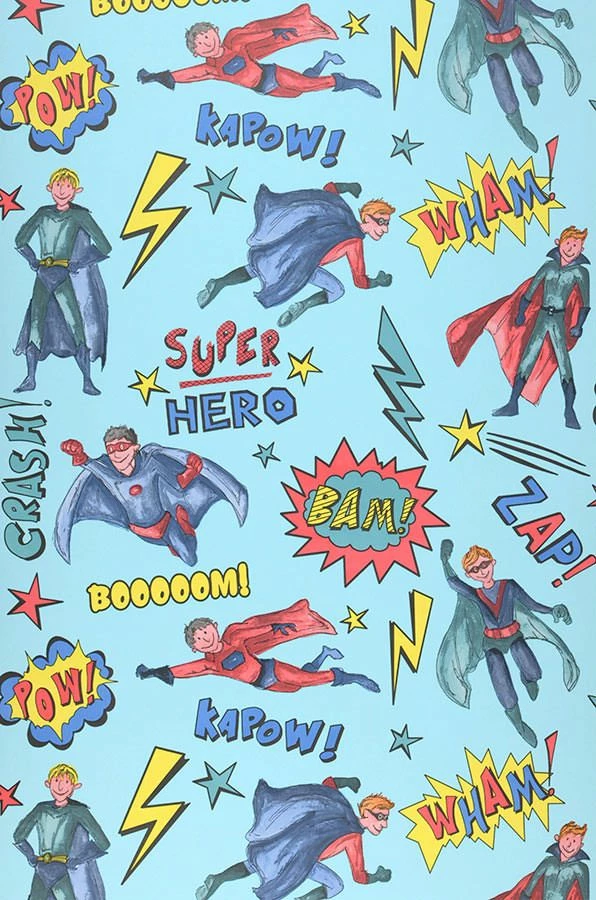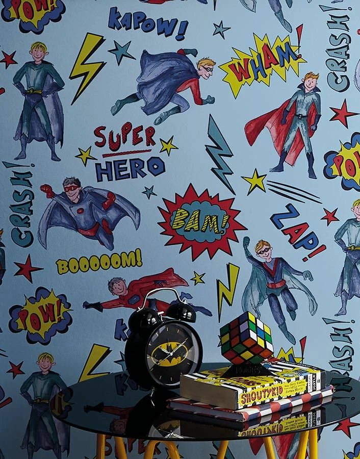 Starke mutige Superhelden sind das große Thema bei Kindertapete Herculan. Wham! Boom! Bam! und Pow! Ab jetzt wird die Welt blitzschnell vor den Bösewichten gerettet. Die rasante Motivtapete lädt zu eigenen Abenteuergeschichten und einem fantastischen Rollenspiel ein. Welcher Held willst Du sein?