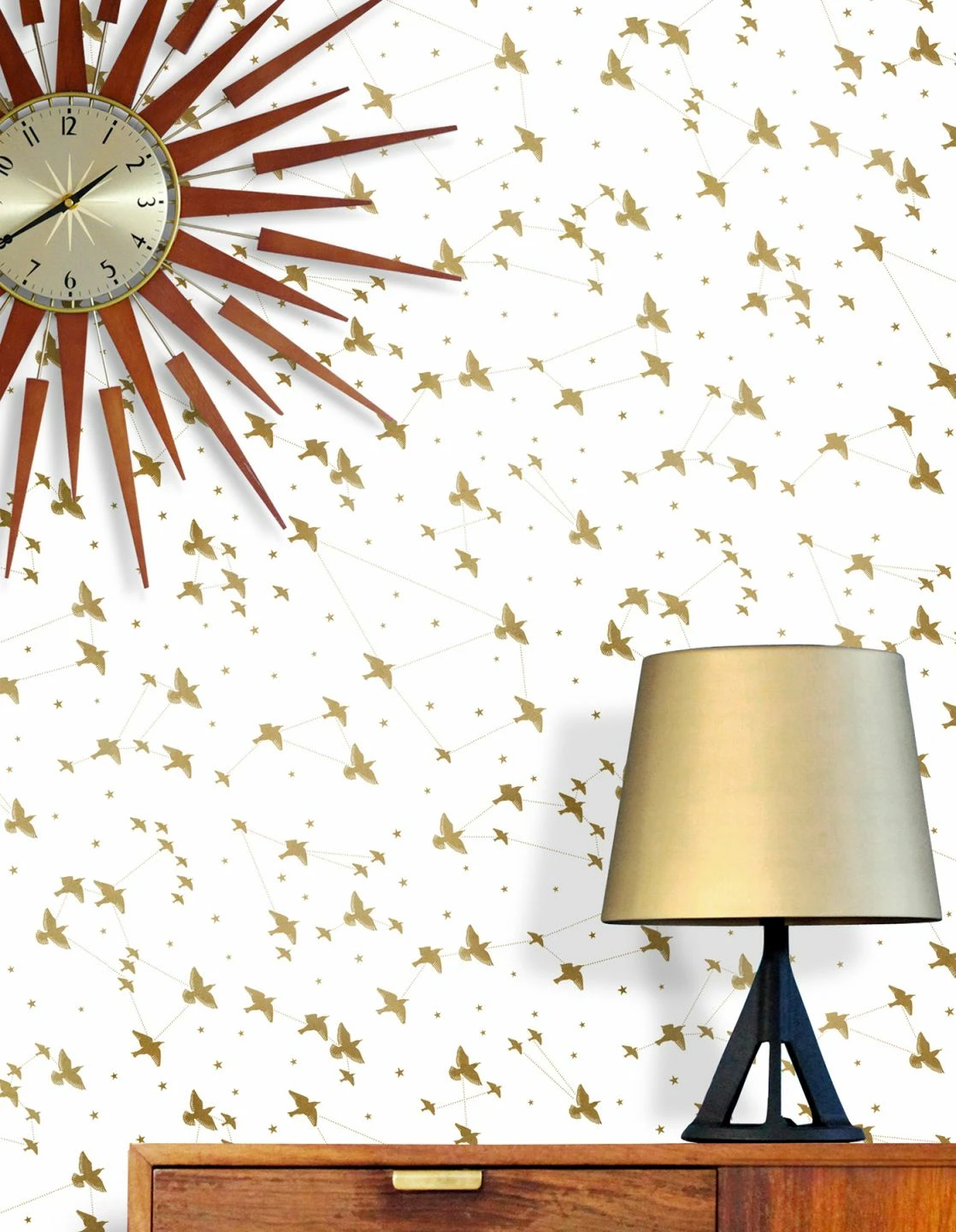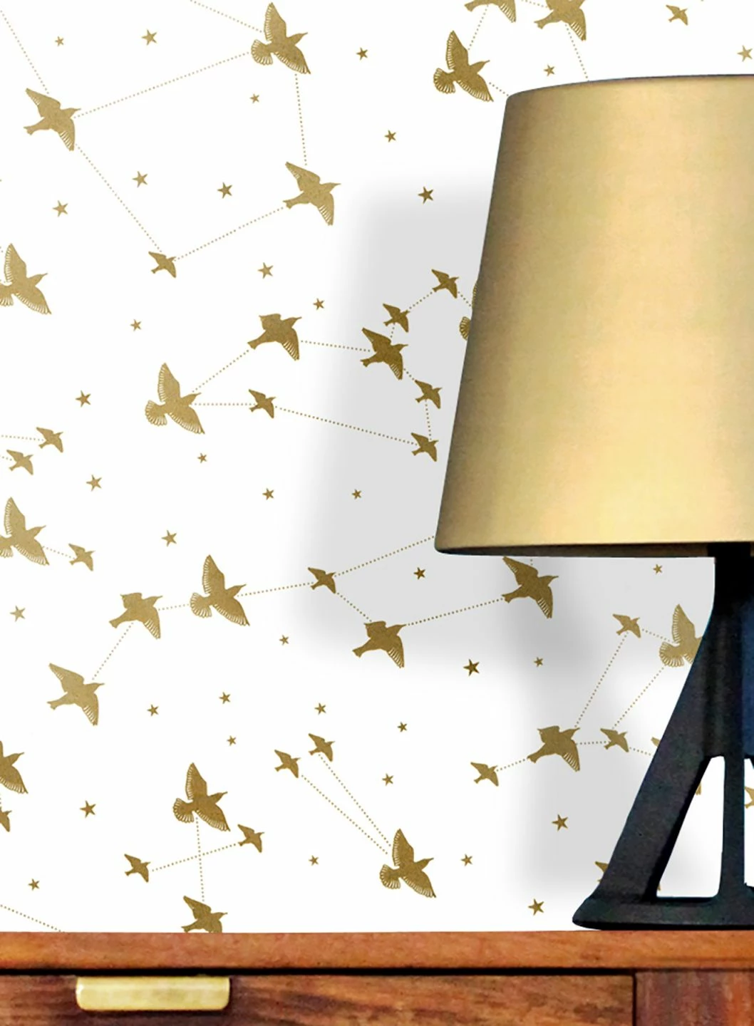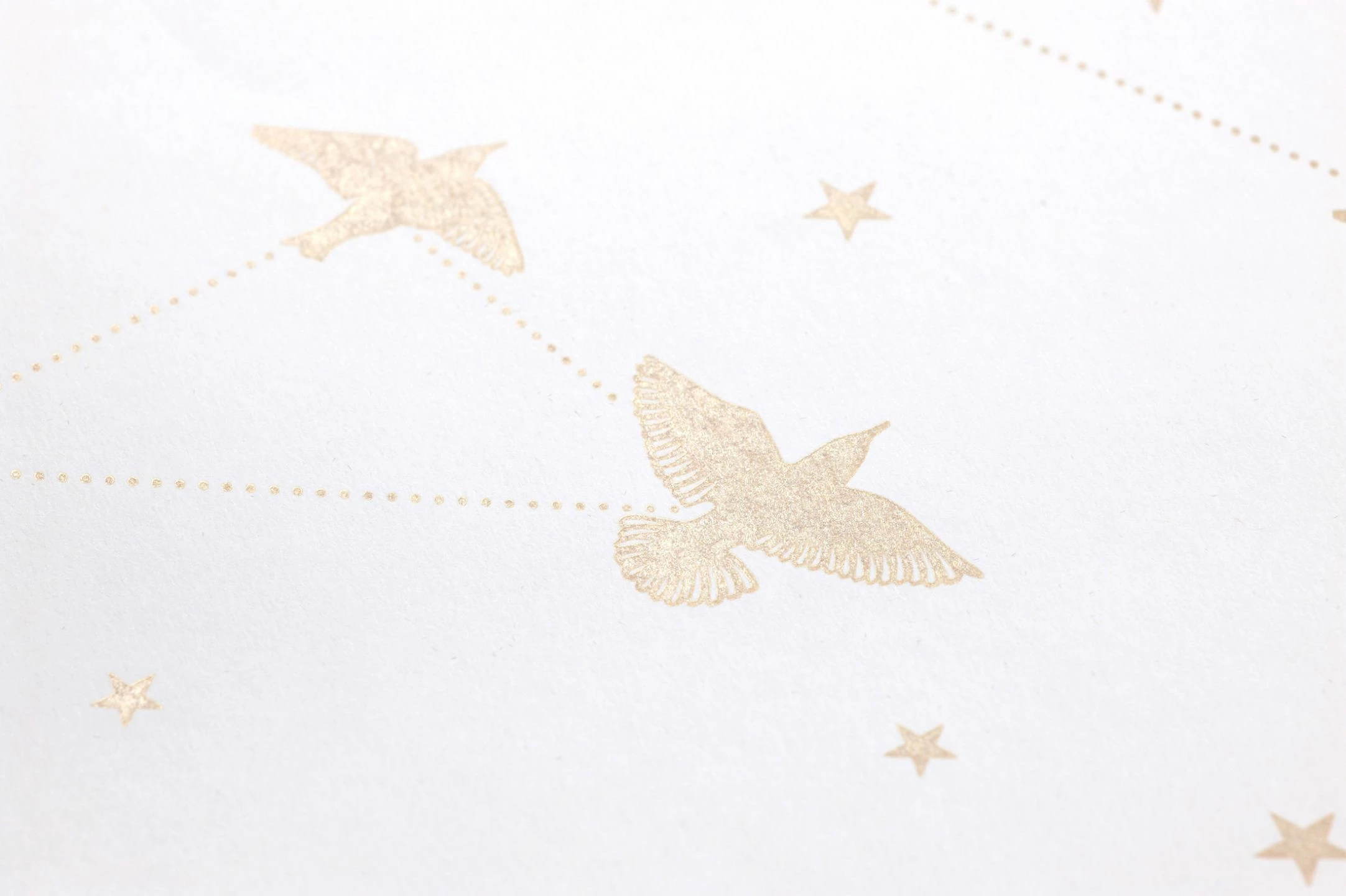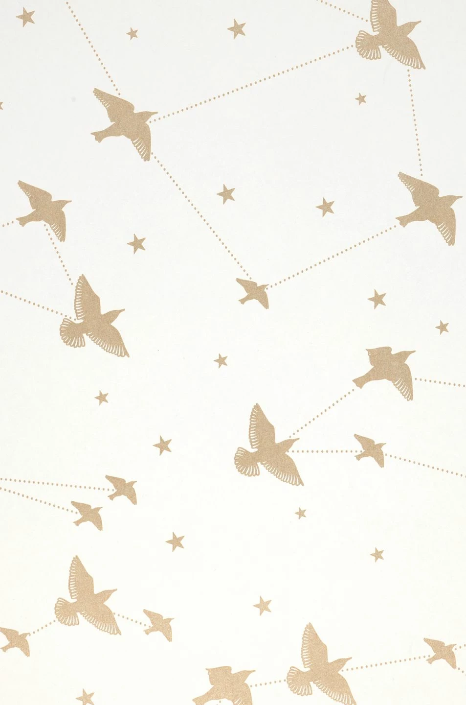 Wenn die Vögel in den Süden ziehen, brechen sie in Scharen auf – Das ist für uns Menschen immer ein eindrucksvolles Schauspiel. Diese Szenerie hält die romantische Designtapete fest und verknüpft sie mit Himmelszelt und Sternbildern. Das schimmernde Muster in Perlgold auf reinem Weiß verleiht dem Ganzen eine glamouröse Note.
