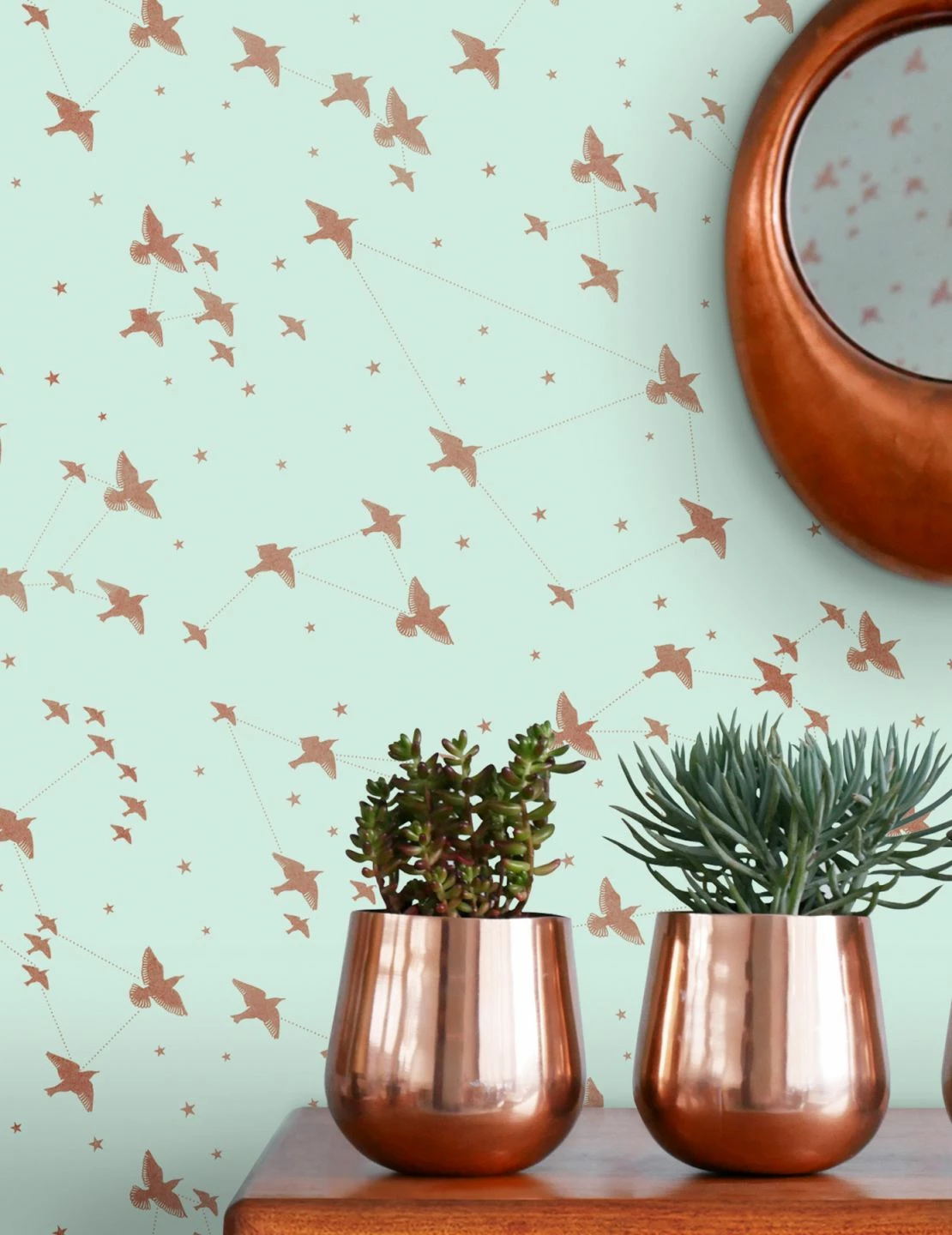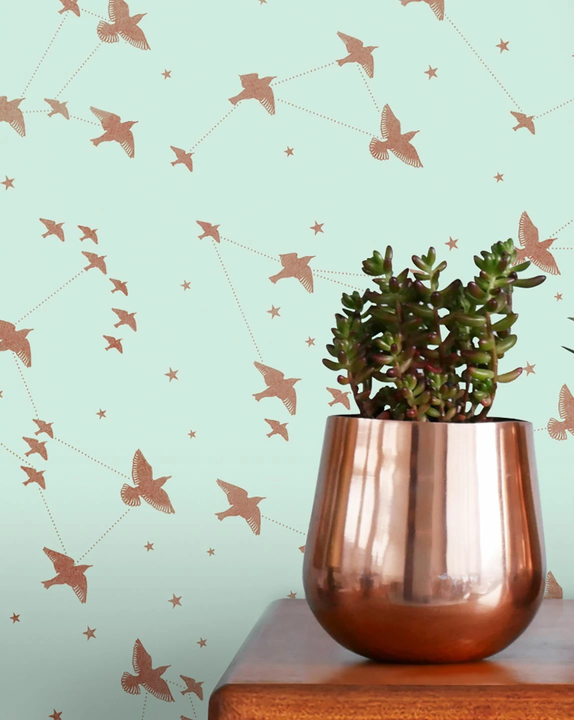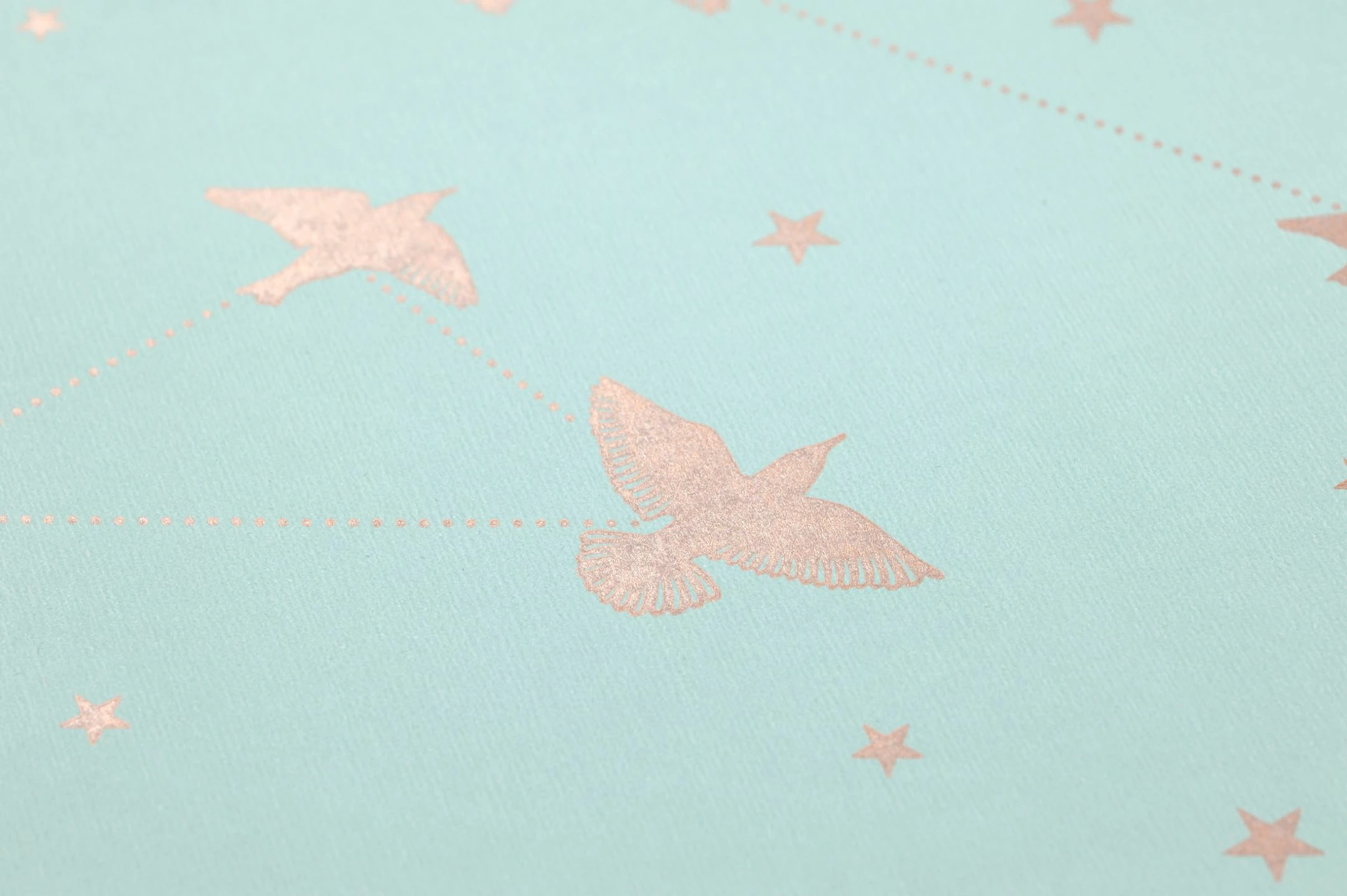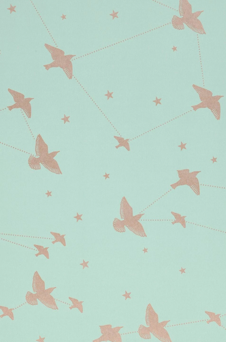 Die reizende Romantik Tapete setzt auf abstrakte und konkrete Bilder und spricht dabei Bände. Himmelszelt, Sternenbilder und Vogelfreiheit symbolisiert die Designtapete in Pastellgrün und Rosenholz. Sternschnuppen zeigen sich, wenn das schimmernde Muster vom Sonnenlicht geküsst wird.