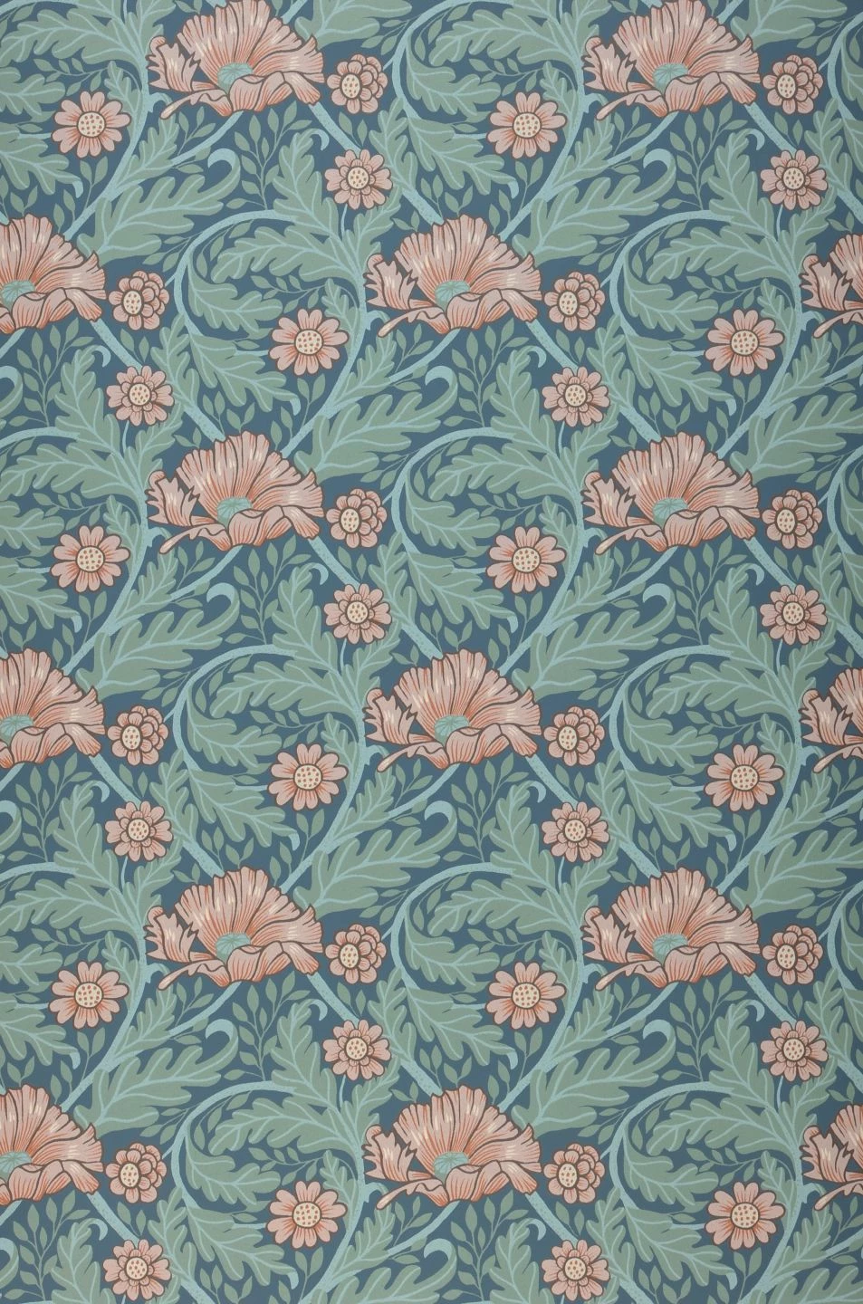 Zwischen dem Pastelltürkis und Schilfgrün der verschlungenen Blattranken, die mit dem blaugrauen Grund eine ästhetische Einheit bilden, kommen die großen Mohnblüten in Dunkelbraun und Hellrosa sowie die kleineren Blümchen besonders schön zur Geltung. Das Design folgt mit seiner klassischen Anordnung und der typischen Farbgebung der Tradition des englischen Tapetendesigns von William Morris und seinen Zeitgenossen im 19. Jahrhundert.