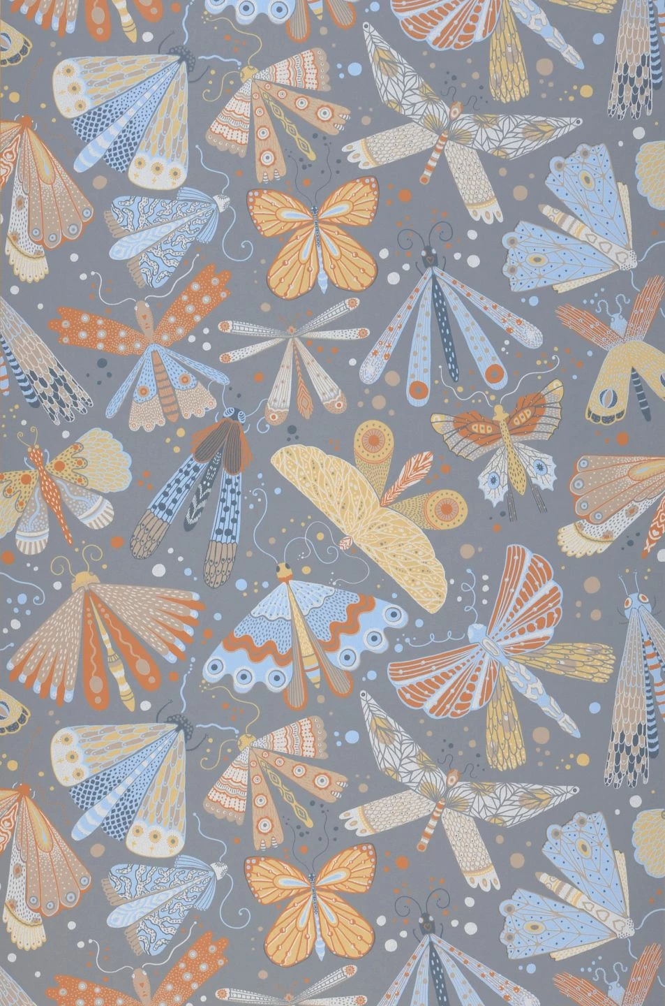 Eine Vielfalt von Faltern und Libellen tummelt sich auf dem grauen Grund, der an das verblassende Licht eines Sommerabends erinnert. Helles Blau und Grauweiß verbinden den grauen Untergrund mit den kräftigeren Farben wie leuchtenden Brauntönen und Sandgelb zu einem faszinierenden Gesamtbild. Die charmante, wie handgemalt wirkende Vliestapete lässt sich auf ganz unterschiedliche Weise ergänzen und schafft immer einen ganz besonderen Raumeindruck.