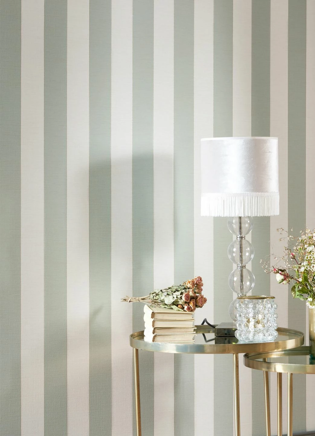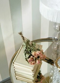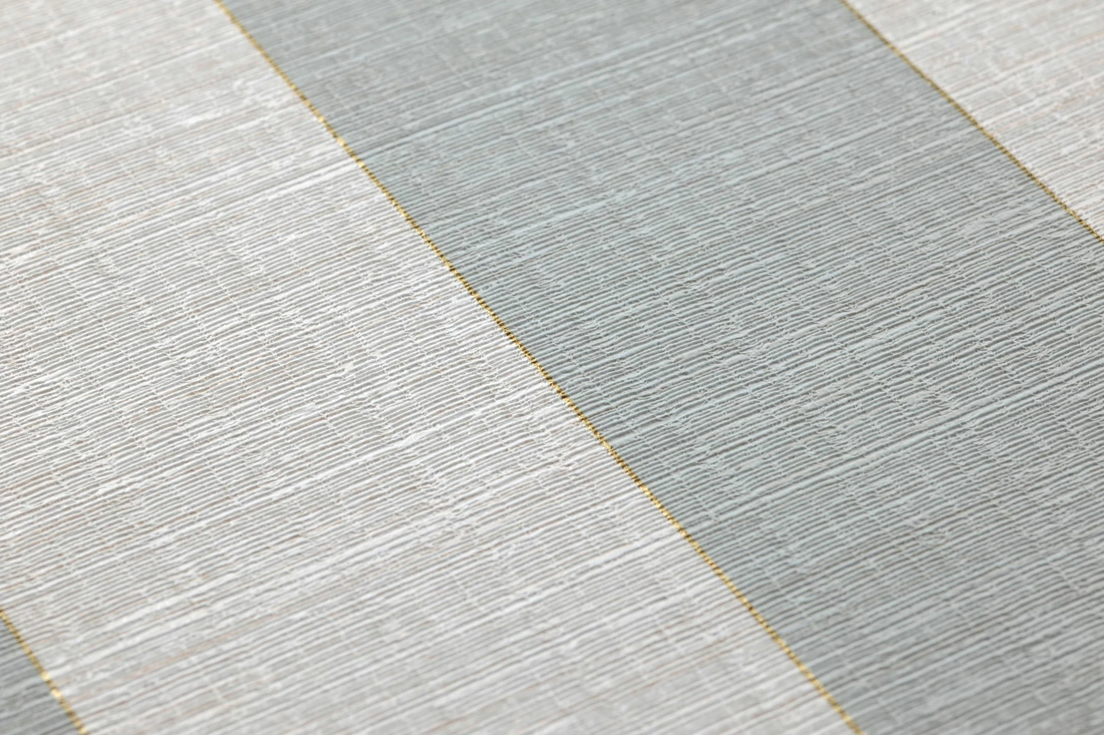 Helles Minttürkis und Weiß in breiten Streifen ergeben eine vornehm zurückhaltende Farbkombination für Ihre vier Wände. Feine goldfarbene Linien setzen die Streifen voneinander ab und entfalten einen warmen Schimmer. Die fühlbare Struktur der Oberfläche lässt die Tapete wirken wie ein Wandschmuck aus Textil. Gleichzeitig macht das Vinyl sie scheuerbeständig und mit ihren sanften Farben selbst für Ihr Badezimmer bestens geeignet.
