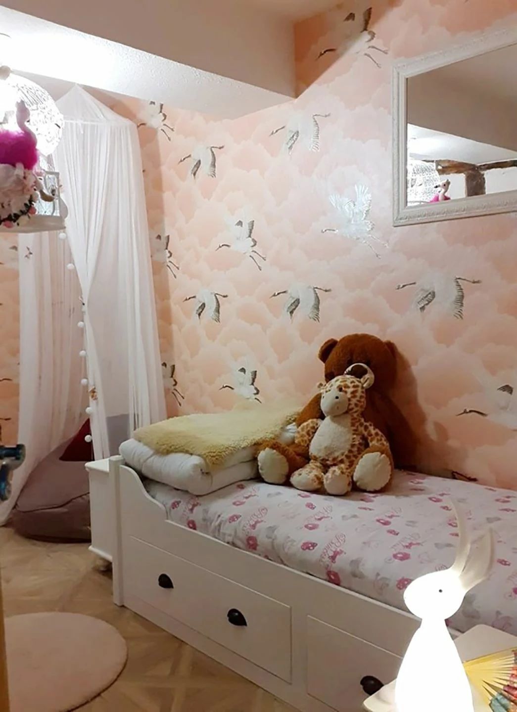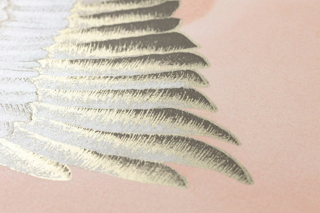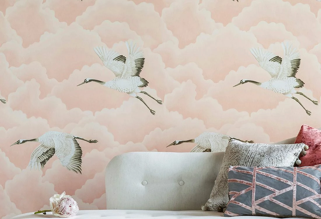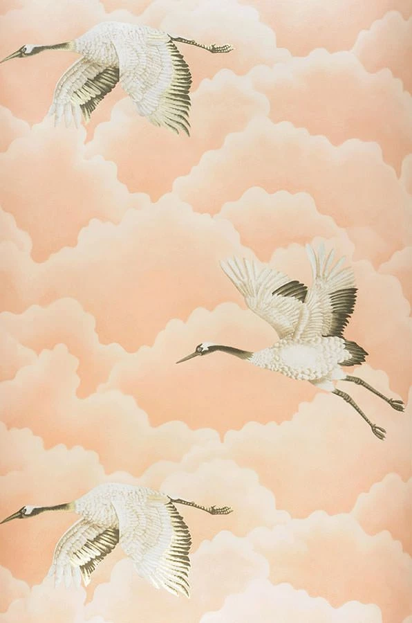 Kraniche, die in der japanischen Kultur als Glücksbringer gelten, ziehen ihre Bahnen zwischen den stilisierten, beigerot schattierten Wolken. Das Gefieder der großen Vögel ist in Dunkelbraun, Beige und schimmerndem Cremeweiß gezeichnet und mit Details in Perlgold verschönert. Mit den Mitteln der asiatischen Kunst perfektioniert die Vliestapete Ihre Einrichtung im minimalistischen, geradlinigen fernöstlichen Stil.