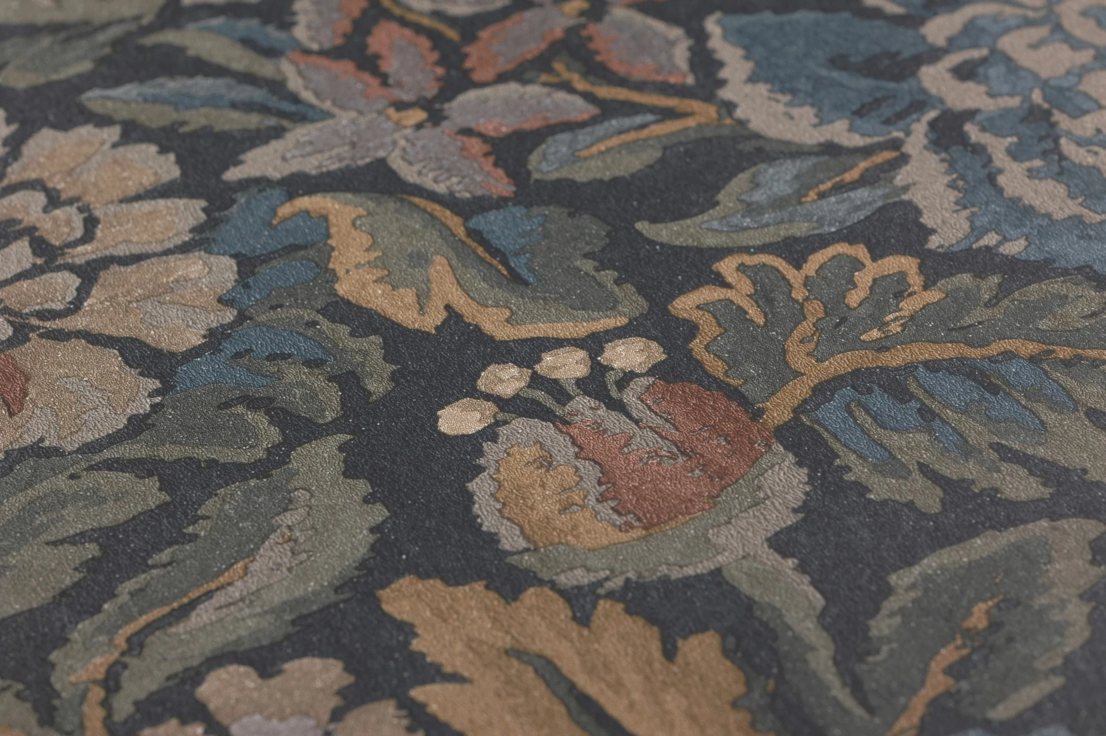 Gedeckte, edel wirkende Farben prägen das prachtvolle Blumenmuster auf dem tief anthrazitfarbenen, ganz leicht gemusterten Untergrund der Vliestapete. Das Zusammenspiel der Farben und der Farbauftrag wirken zusammen für den Eindruck eines wertvollen Wandbehangs, der Ihre Räume zu einer Kostbarkeit macht. Die florale Tapete Isola unterstützt die Wirkung antiker, dunkler oder in einer der Musterfarben gestrichener Möbel wunderschön.