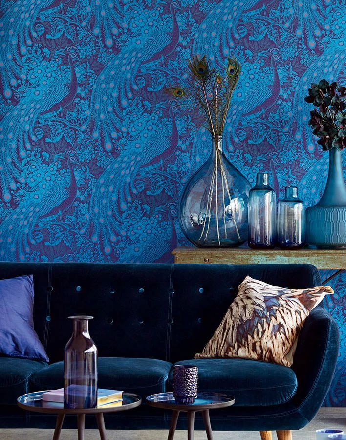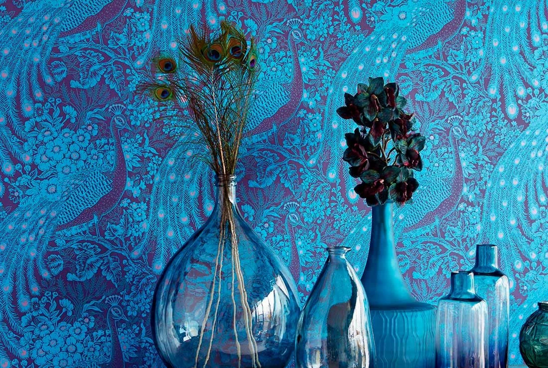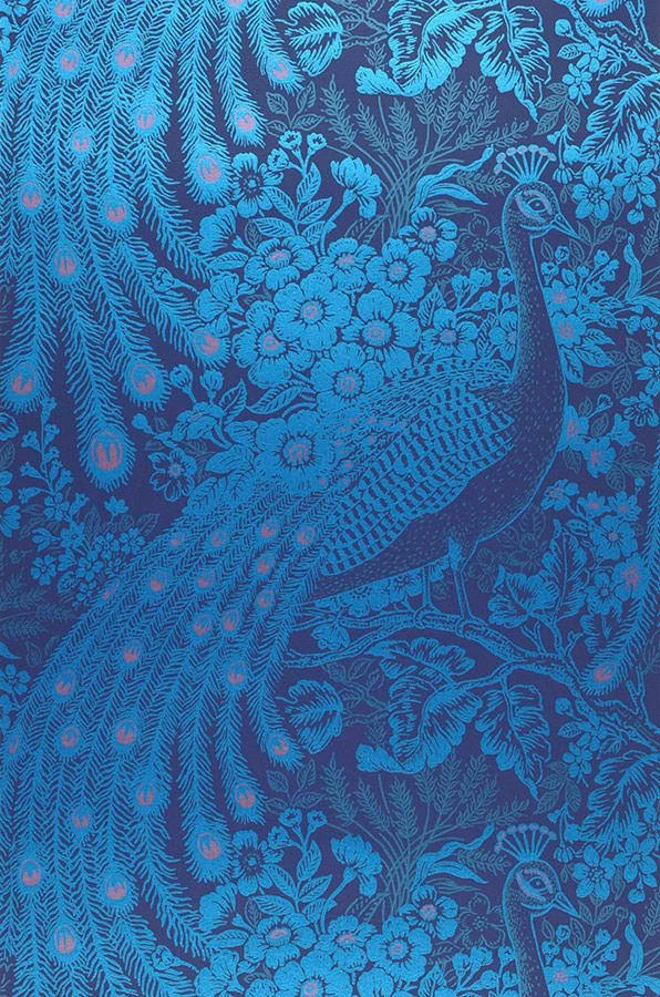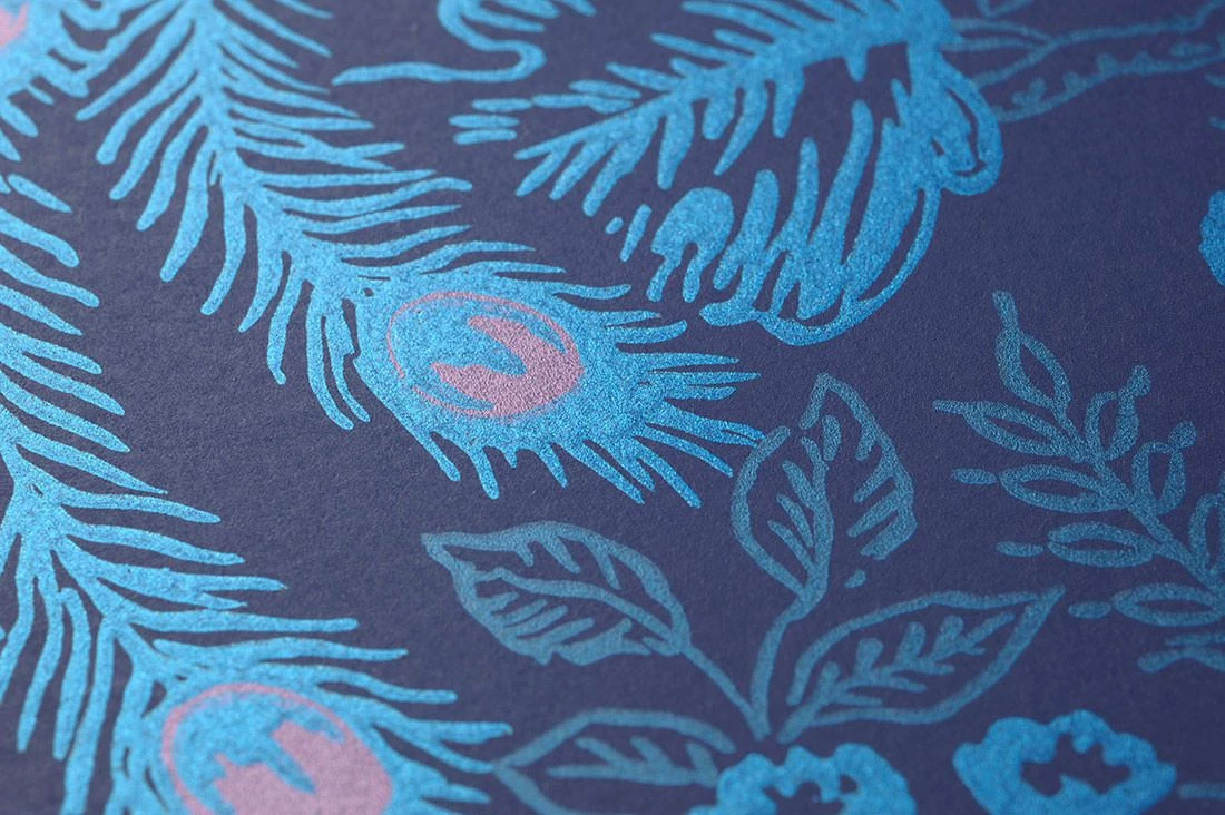 Ausdrucksstark, eindrucksvoll, unkonventionell – Die Effekt Tapete im Jugendstildesign mit Pfauen und floralen Elementen erhält durch den nachtblauen Grundton und die schimmernden Musterelemente in Altrosa, Grünblau, Perlblau eine tiefgründige Magie mit Wow-Effekt. Fantastisch plastisch für chillige Lounges und exaltierte Wohn-, Schlaf- und Baderäume.