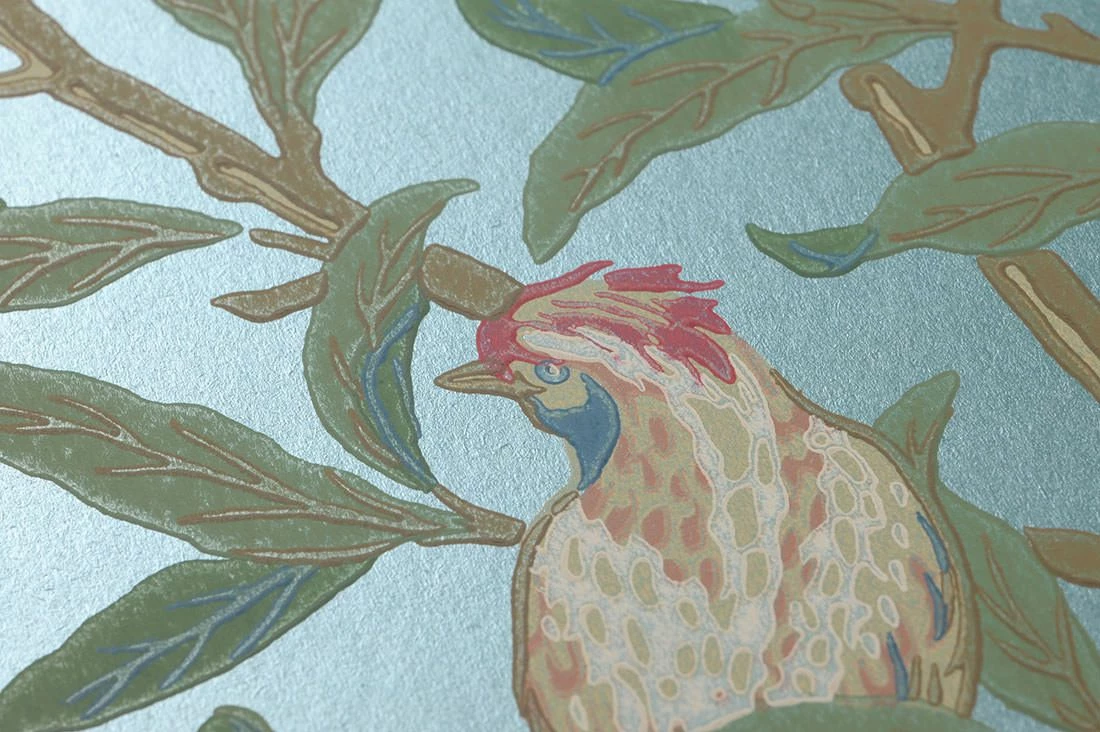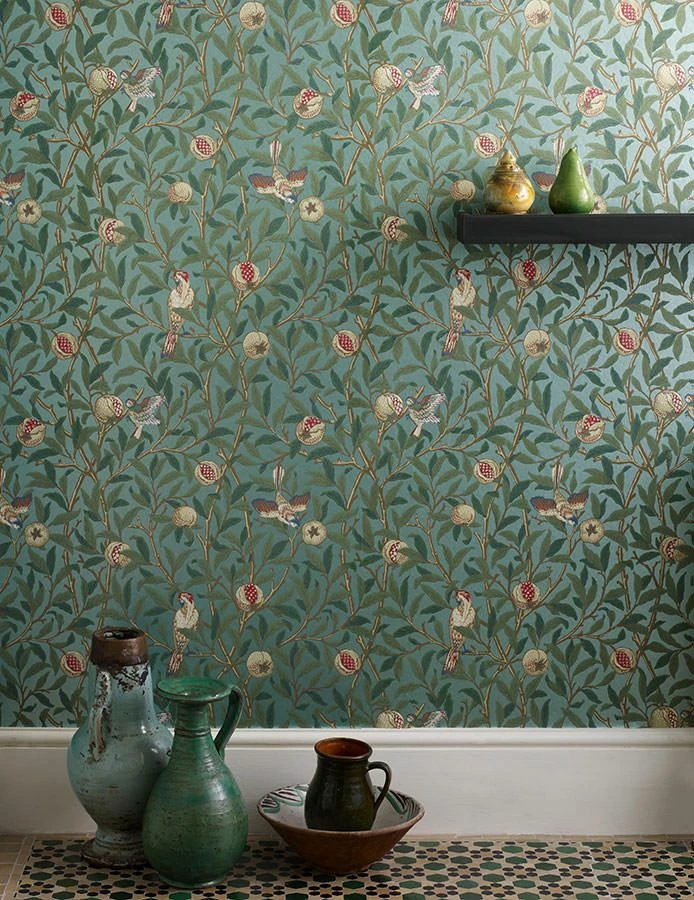 Zwischen den üppigen Granatapfelzweigen und -Früchten tummeln sich Vögel auf der Suche nach dieser Köstlichkeit. Der Untergrund schimmert in Pastelltürkis und macht dieses Stück so einzigartig.