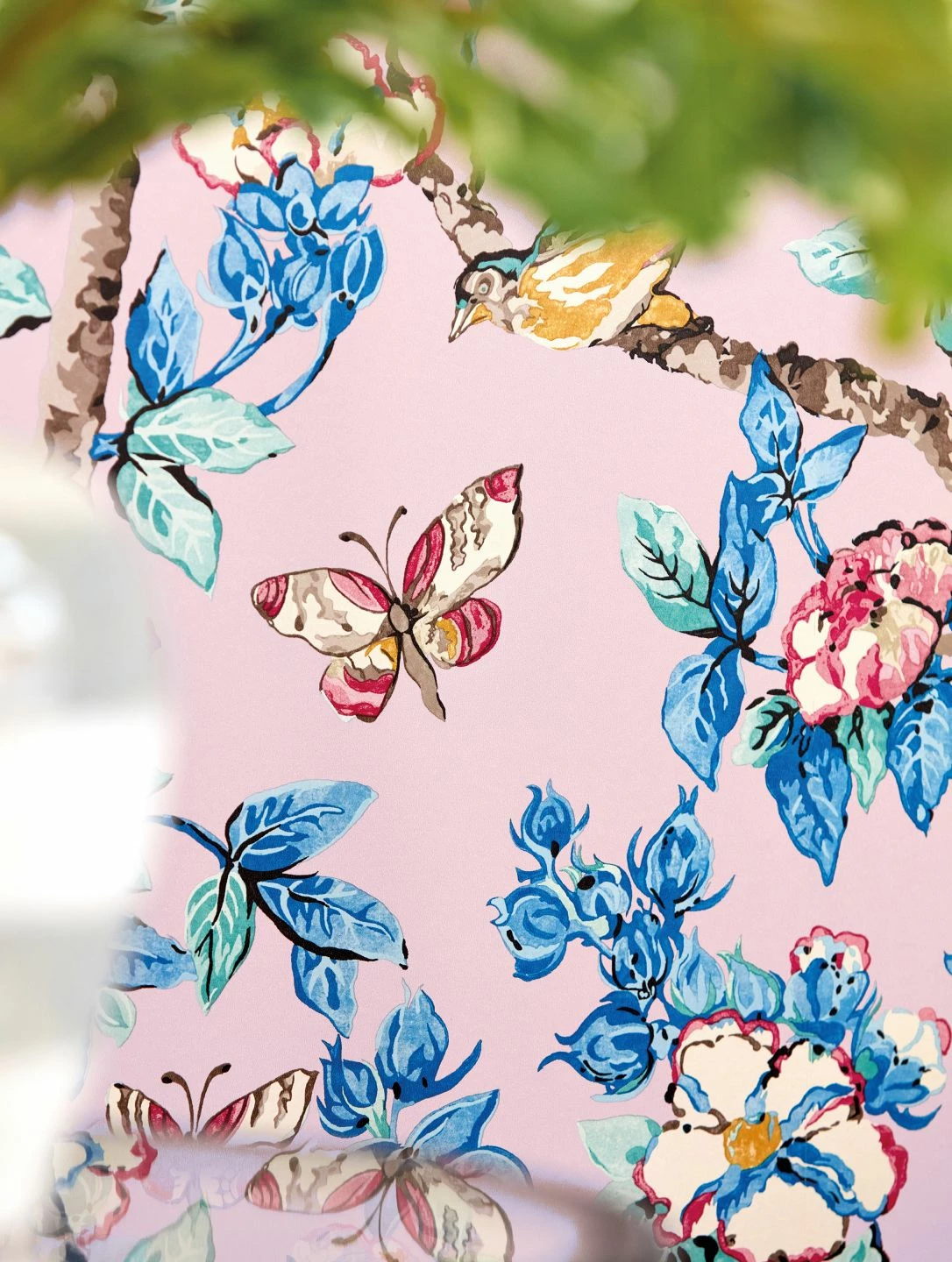 Poetisch und farbenfroh dekorieren Sie Ihren Raum mit der botanischen Tapete Jardine. Wie auf einem Gemälde im Stil der asiatischen Kunst wirken die Zweige voller Blätter in sanften Blautönen und Blüten in Perlweiß und Orientrot. Vögel mit buntem Gefieder und Schmetterlinge vervollkommnen das Bild. Mit schönen Details sind die Blüten, Blätter und die Flügel der Schmetterlinge versehen. Ein wahres Kunstwerk für Ihre Wände!