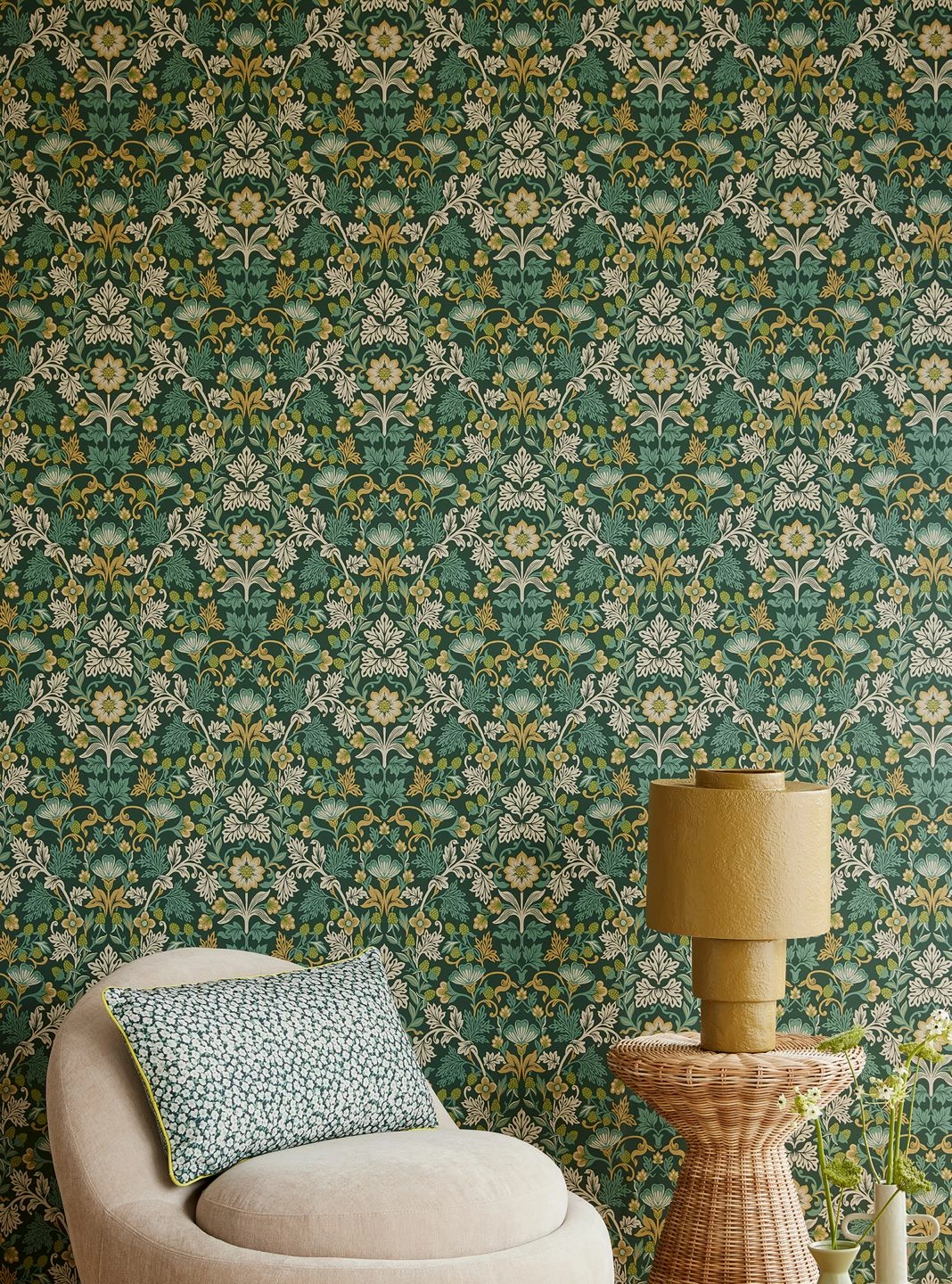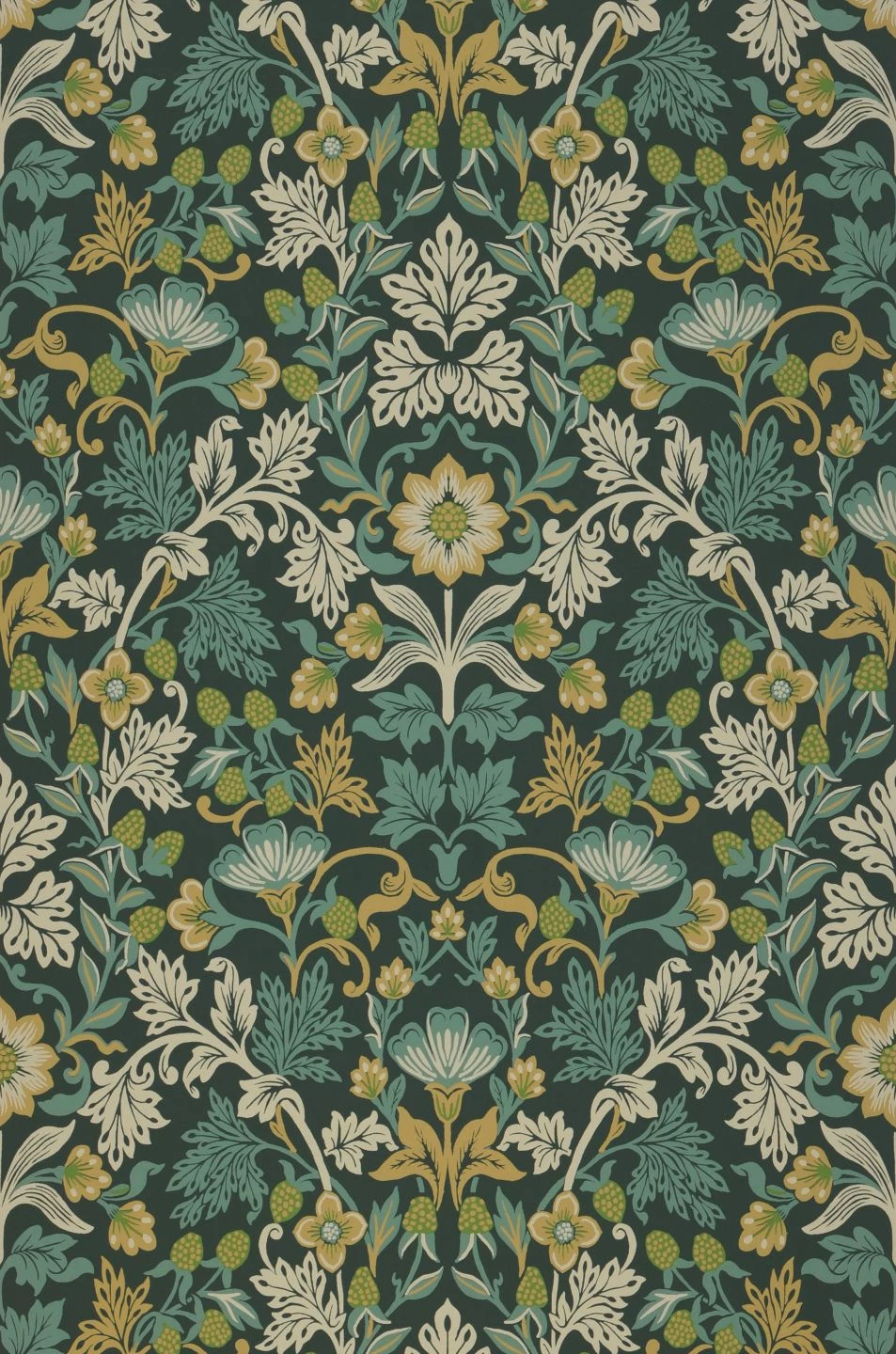 Die klassisch anmutende, symmetrische Anordnung der Ornamente löst sich bei näherem Hinsehen auf in eine schier endlose Fülle von Blüten, Früchten und Blattranken. So mischt Josefin unter die Tradition des barocken Blumendesigns eine große Portion skandinavischer Einflüsse. Die stilisierten Blüten wirken natürlicher, die Farben auf dem minttürkisfarbenen Grund sind durch die vorherrschenden Gelb- und Grüntöne frischer und kühler als ihre barocken Vorläufer.