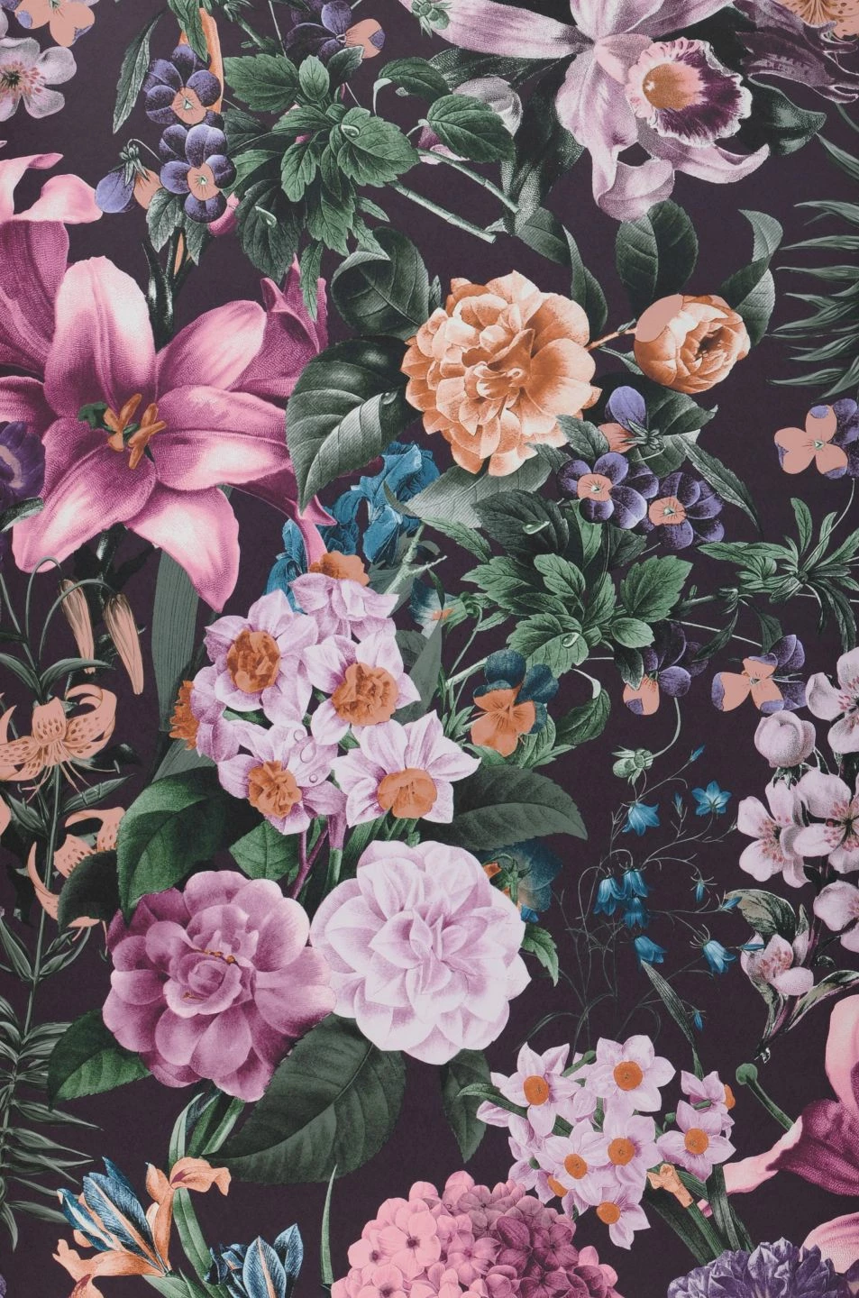 Die Fülle und Vielfalt der prachtvollen Blüten auf dieser Vliestapete ergibt durch die Konzentration auf verschiedene Violett- und Rosatöne neben Hellbraun, Petrol und Tannengrün auf dem schwarzvioletten Grund ein abgerundetes Gesamtbild. Edel und hochwertig wirkt die florale Tapete in Ihrem Wohn- oder Schlafzimmer. Besonders schön passen weiße Möbel oder Einrichtungselemente in einer der Musterfarben, um die Wirkung zu unterstreichen.