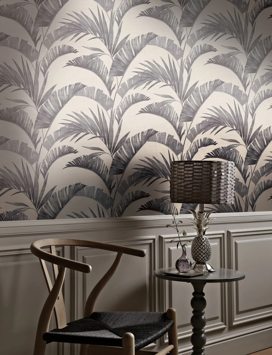 Palmen als Luxusfaktor, z.B. für den exzentrischen Boheme-Stil oder ein orientalisch-exotisches Flair im Raum. Vliestapete Jumana mit plakativem Palmzweigmuster, das in Grautönen zart schimmert, ist die richtige Wahl und zaubert dezente Lichtreflexe. Die hochwertige florale Designtapete harmoniert mit Silber, rauchigen Violetttönen und Naturmaterialien.