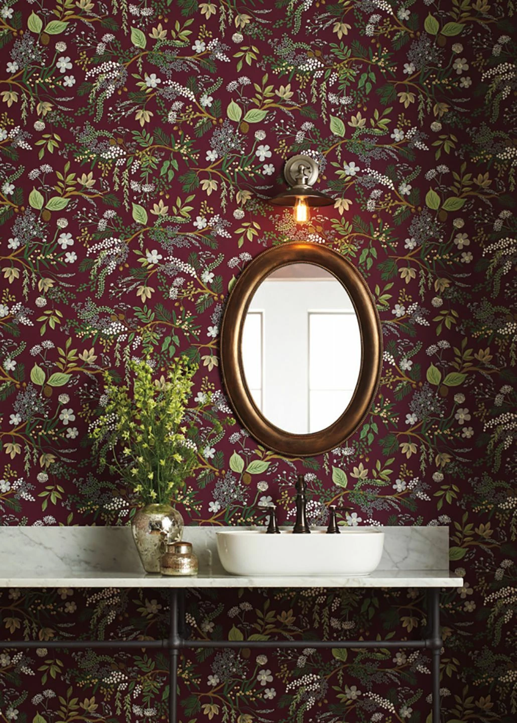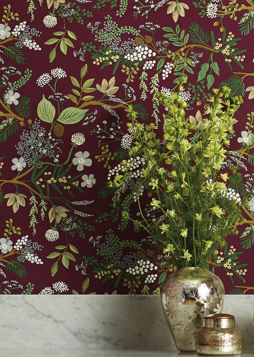 Blüten, Blätter und Beeren in hellen Grün-, Grau und Elfenbeintönen heben sich wunderschön vom bordeauxfarbenen Hintergrund dieser Papiertapete ab. Elegant und gleichzeitig voller Leben ist der Eindruck, der durch die dicht an dicht gemalte Blütenpracht entsteht. Herbstliche Farben spielen mit den einfallenden Sonnenstrahlen und leuchten anheimelnd.