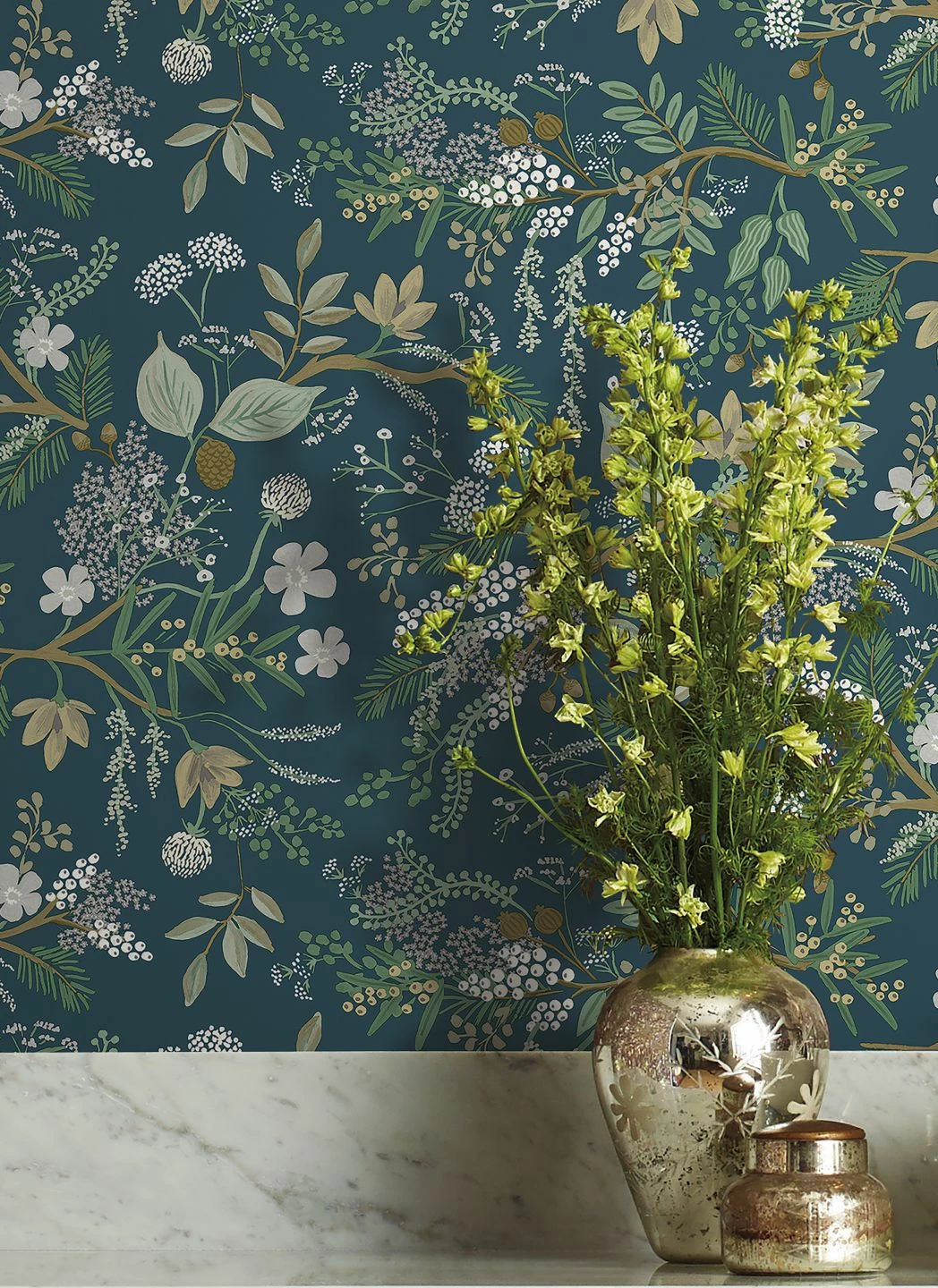 Hochwertig und dekorativ ist diese Papiertapete aus dem Hause Rifle Paper. Die verschiedensten Zweige, Blätter und Blüten wirken wie von Hand mit dem Pinsel auf das Papier getupft. Das harmonische Zusammenspiel der vorherrschenden Grün- und Brauntöne mit dem graublauen Grund kreiert eine stimmige Atmosphäre, die antike Möbel ebenso überzeugend begleitet wie Einrichtungen im Landhaus-Stil.
