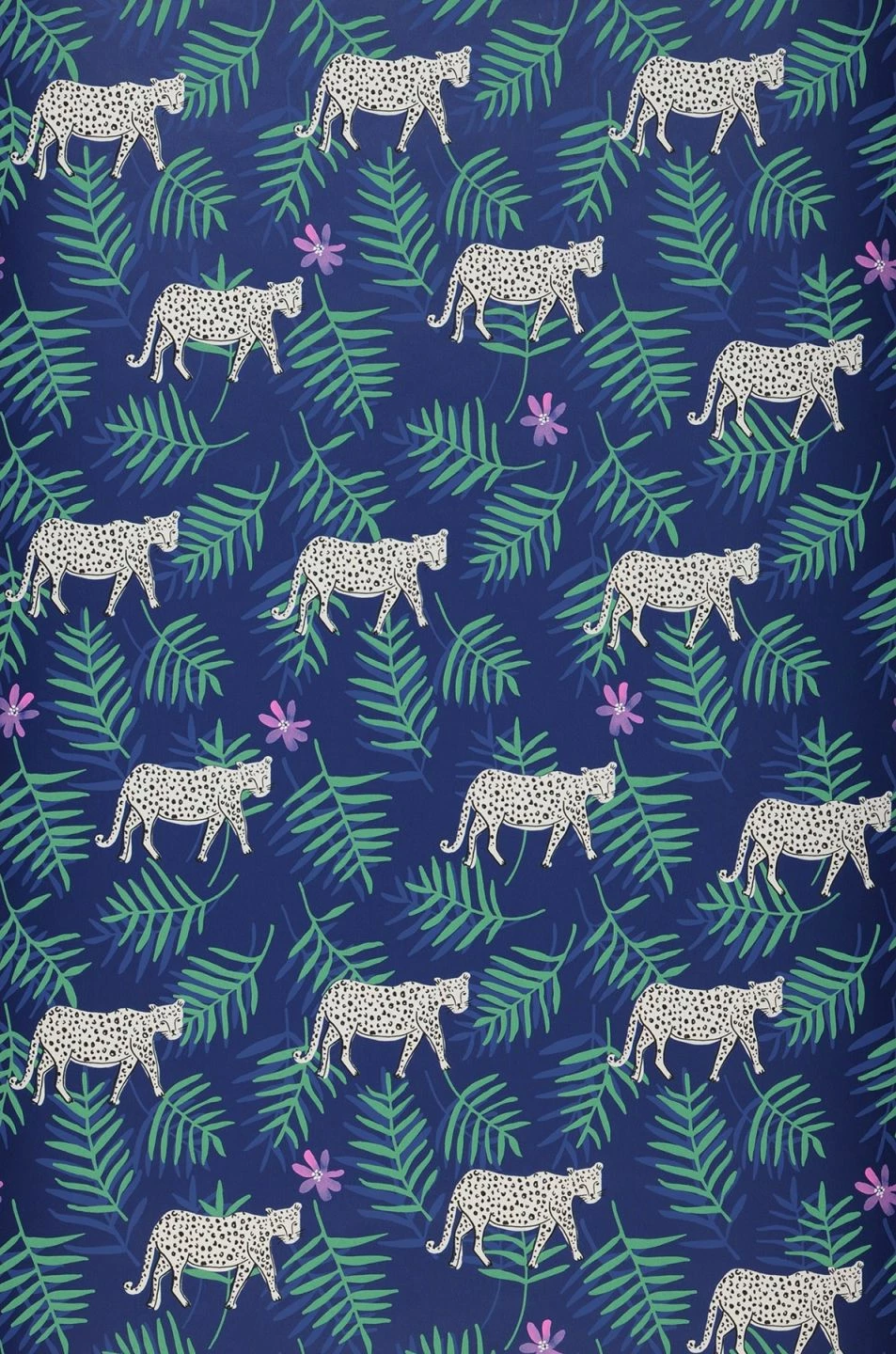 Saphirblau wie eine Tropennacht ist der Untergrund dieser exotischen Tiermotiv-Tapete. Zwischen filigranen Palmwedeln in Patinagrün und Violettblau und zarten hellvioletten Blüten leuchtet das weiße Fell von Leoparden mit ihrer typischen Fleckenzeichnung hervor. Weiße Einrichtungsgegenstände, aber auch antike Möbel in dunklen Holztönen schaffen einen Raum mit einer ganz individuellen Atmosphäre.