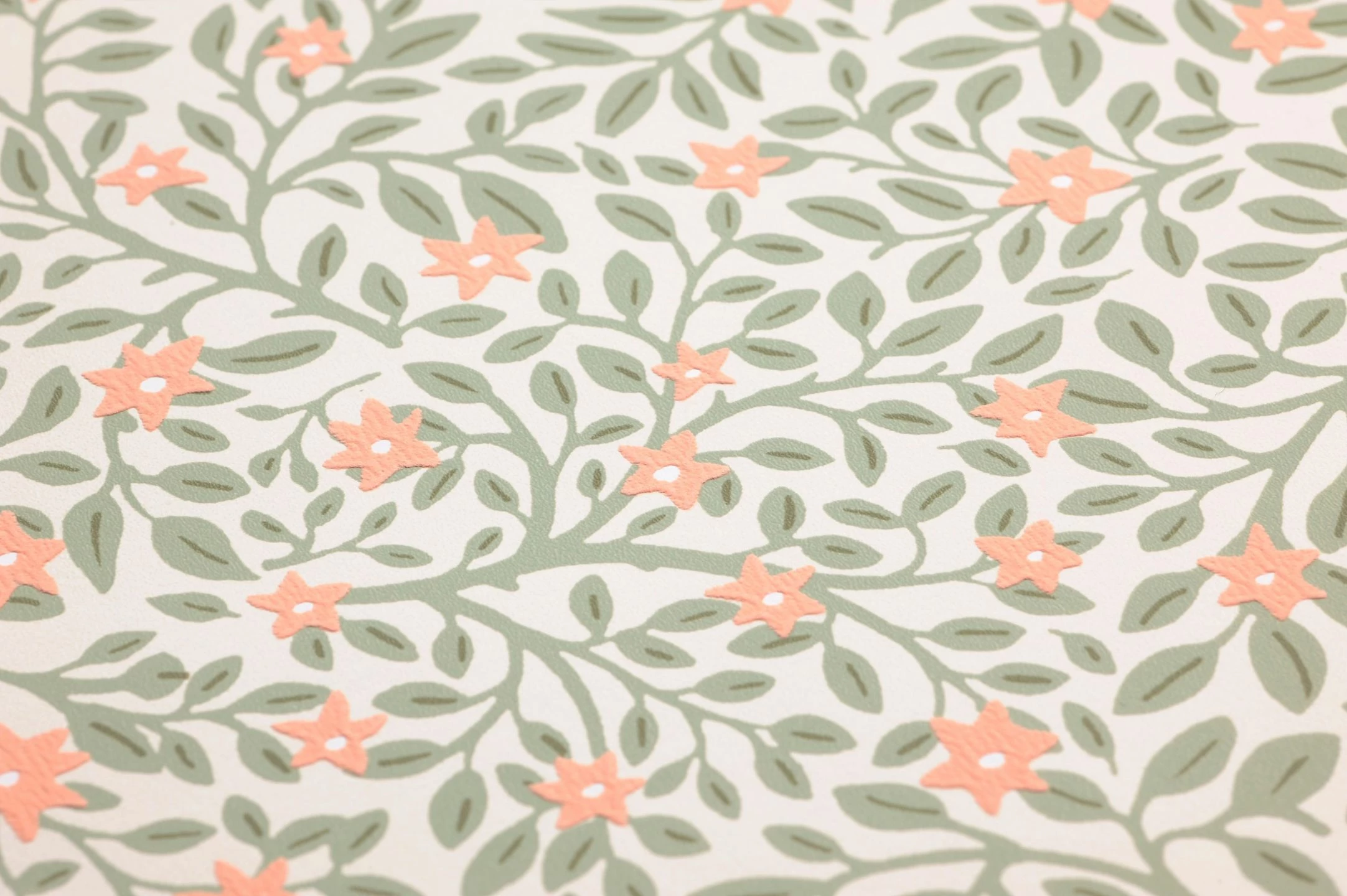 Ein zartes Blumenmuster, das mit den feinen Blattranken und den sternförmigen lachsorangefarbenen Blüten an den Frühling erinnert. Auf dem zartgrünen Grund wirkt das Design luftig und leicht. Holzmöbel in allen Naturtönen passen wunderschön zur Vliestapete Karina – in einer Küche ebenso gut wie in Ihrem Esszimmer, Wohnzimmer oder Schlafzimmer. Wer würde sich inmitten dieser Blütenzweige nicht zu Hause fühlen?