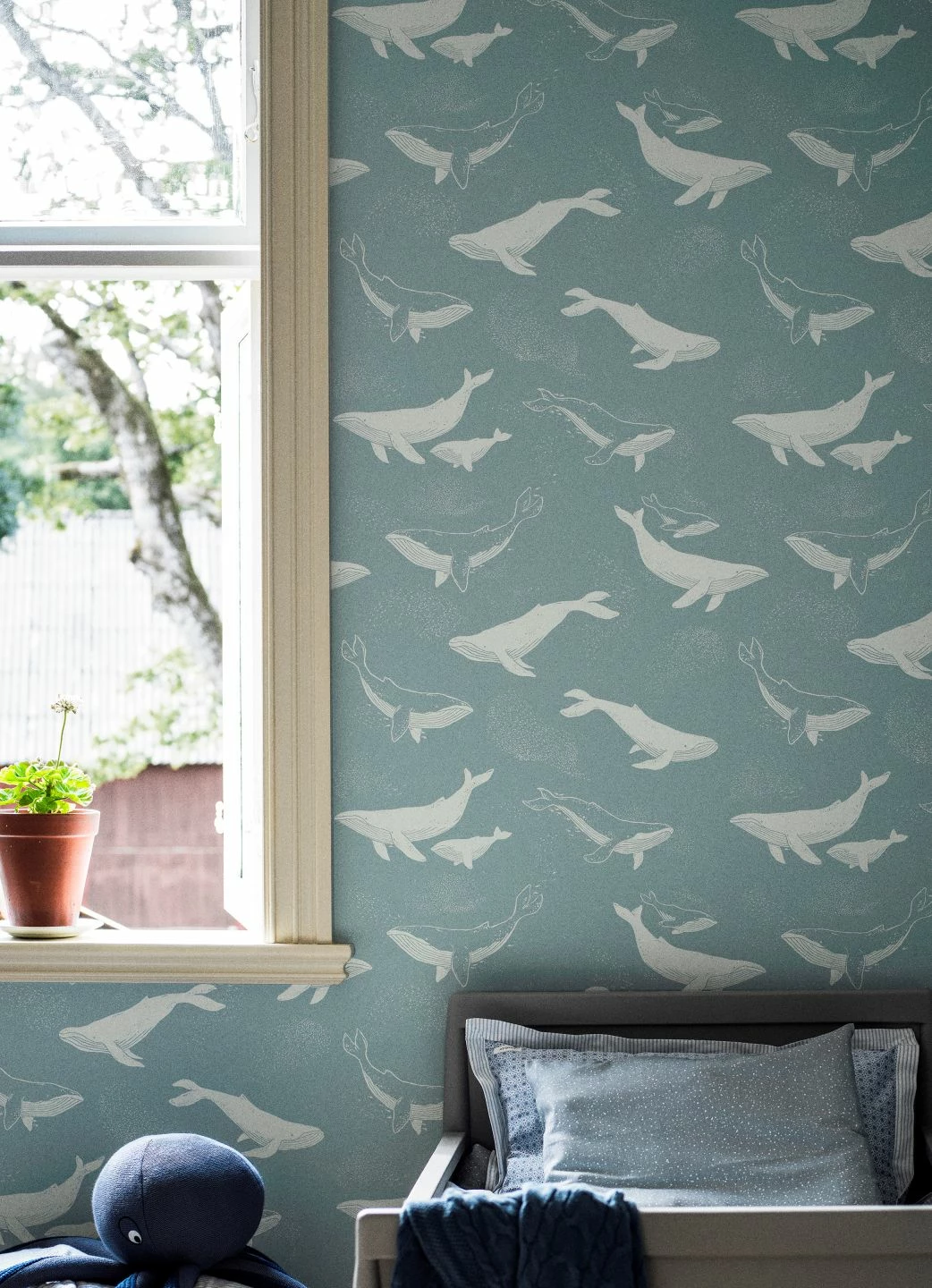 Wale, die sanften Riesen der Weltmeere, sind faszinierende Tiere. Ihre Größe, ihr scheinbar schwereloses Gleiten durch die Ozeane, ihre Gesänge, ihr Sozialverhalten sind einzigartig. Und so ist Vliestapete Keiko mit ihren cremeweißen Blauwalen auf dem hellblaugrauen Grund nicht nur für ein Kinderzimmer eine tolle Kulisse. Warum nicht ein Schlafzimmer damit ausstatten und zwischen den riesigen Meeressäugern Erholung und Entspannung finden?