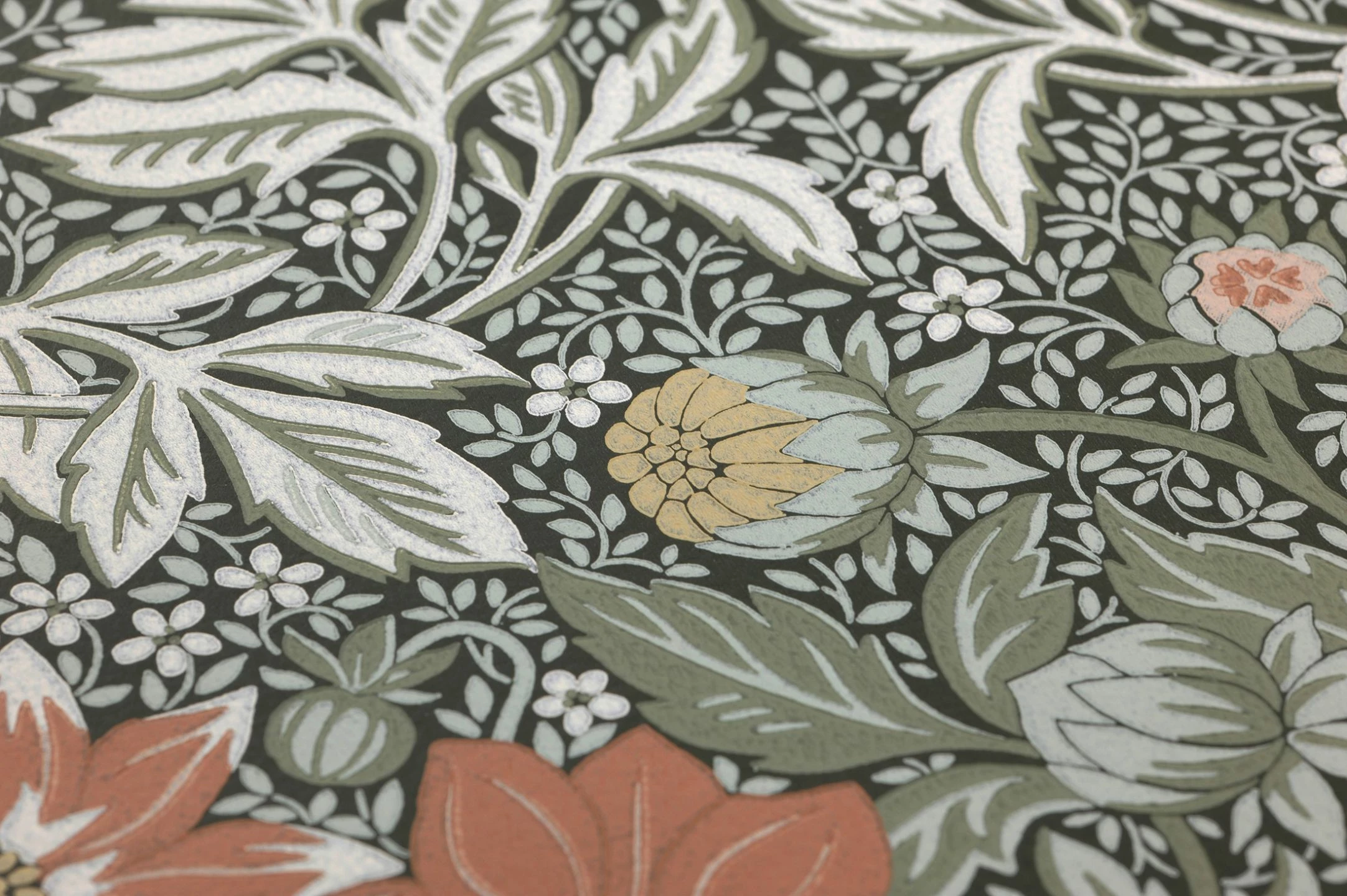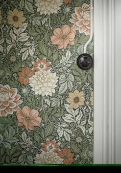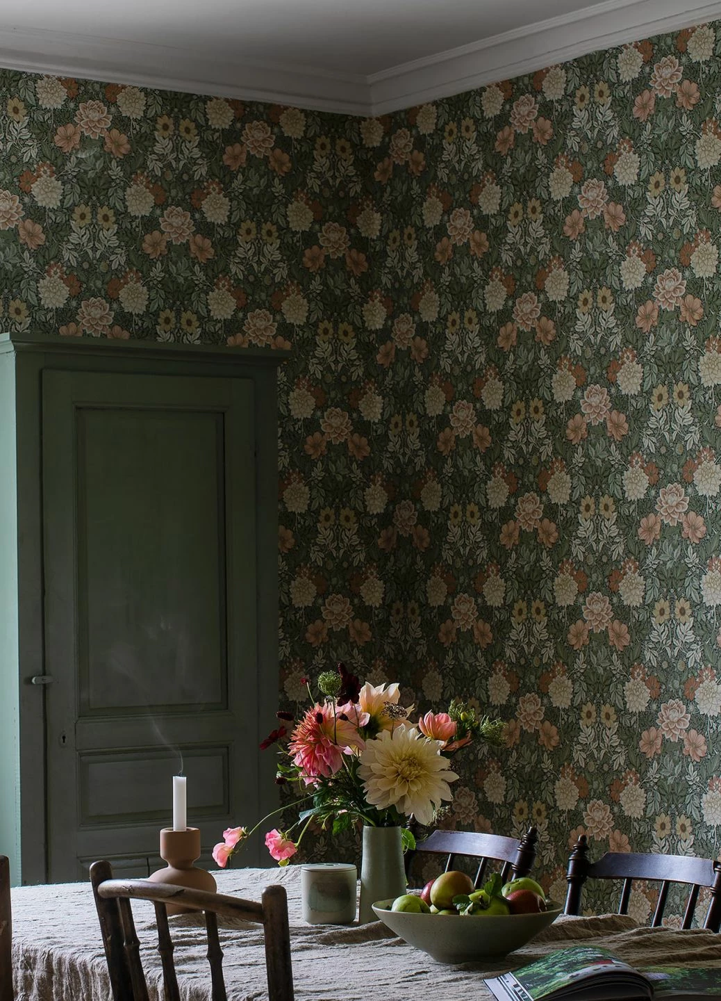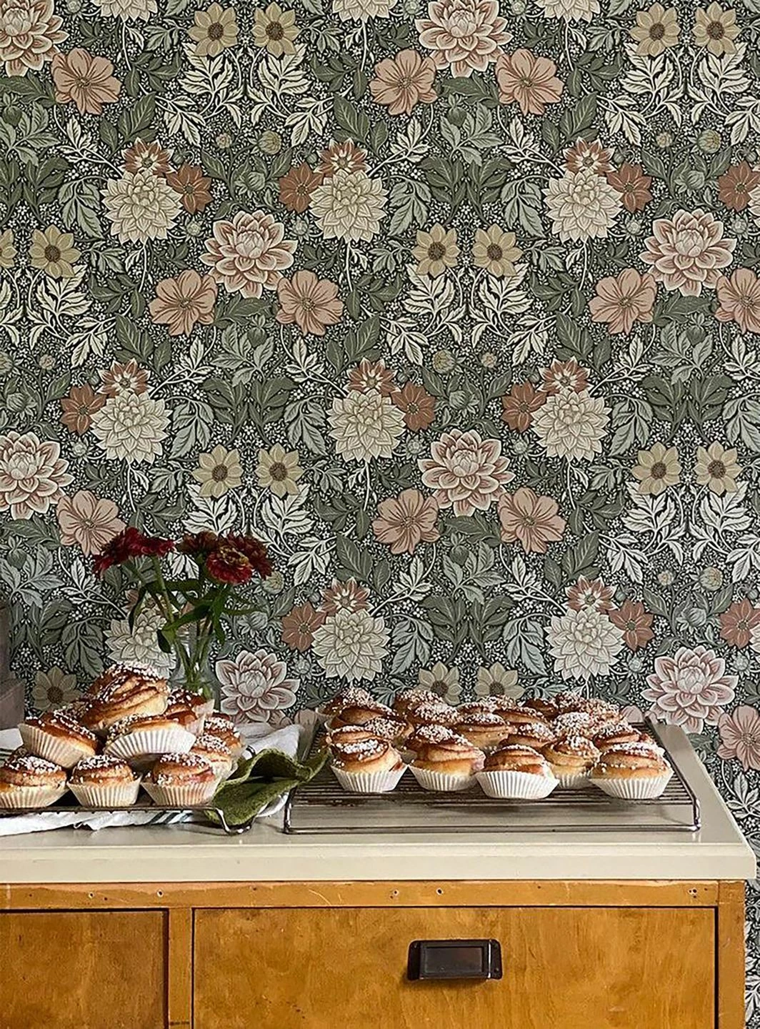 Wie ein großes Blumenbeet voller verschiedener Dahlien wirkt das Muster der Vliestapete „Kerala“. Die großen Blüten in Beige- und Brauntönen harmonieren perfekt mit dem tannengrünen Untergrund, der von kleinen hellen Blümchen zusätzlich belebt wird. Der Leimdruck in Verbindung mit der zugrundeliegenden Symmetrie, in der die Blumen angeordnet sind, bringt einen Hauch von Jugendstil mit und passt ideal zu Möbeln im Retro-Look.