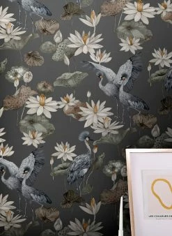 Besonders elegant vermittelt die orientalische Tapete Kimora die asiatische Ästhetik. Auf dem dunkelgrauen Grund sind mit liebevollen Details versehene Kronenkraniche abgebildet. Dazwischen Lotosblumen, teils voll erblüht, teils als heranwachsende Knospen. Ihre charakteristischen Blätter komplettieren das Design. Das Spiel mit den Größenverhältnissen setzt der realistischen Zeichnung der Kraniche und Lotosblumen eine Portion Abstraktheit entgegen und schafft ein reizvolles Spannungsfeld.