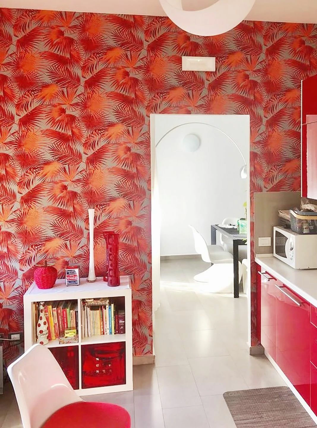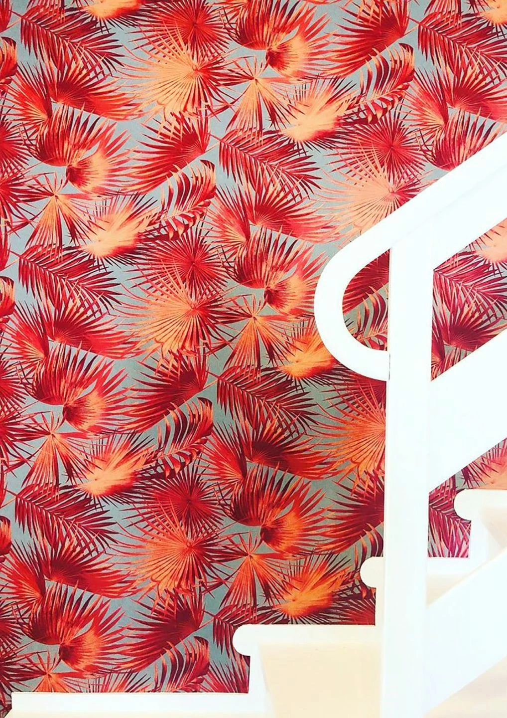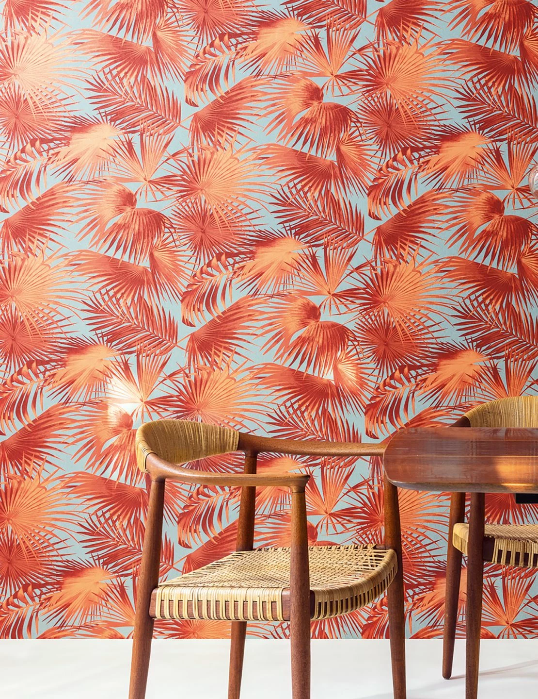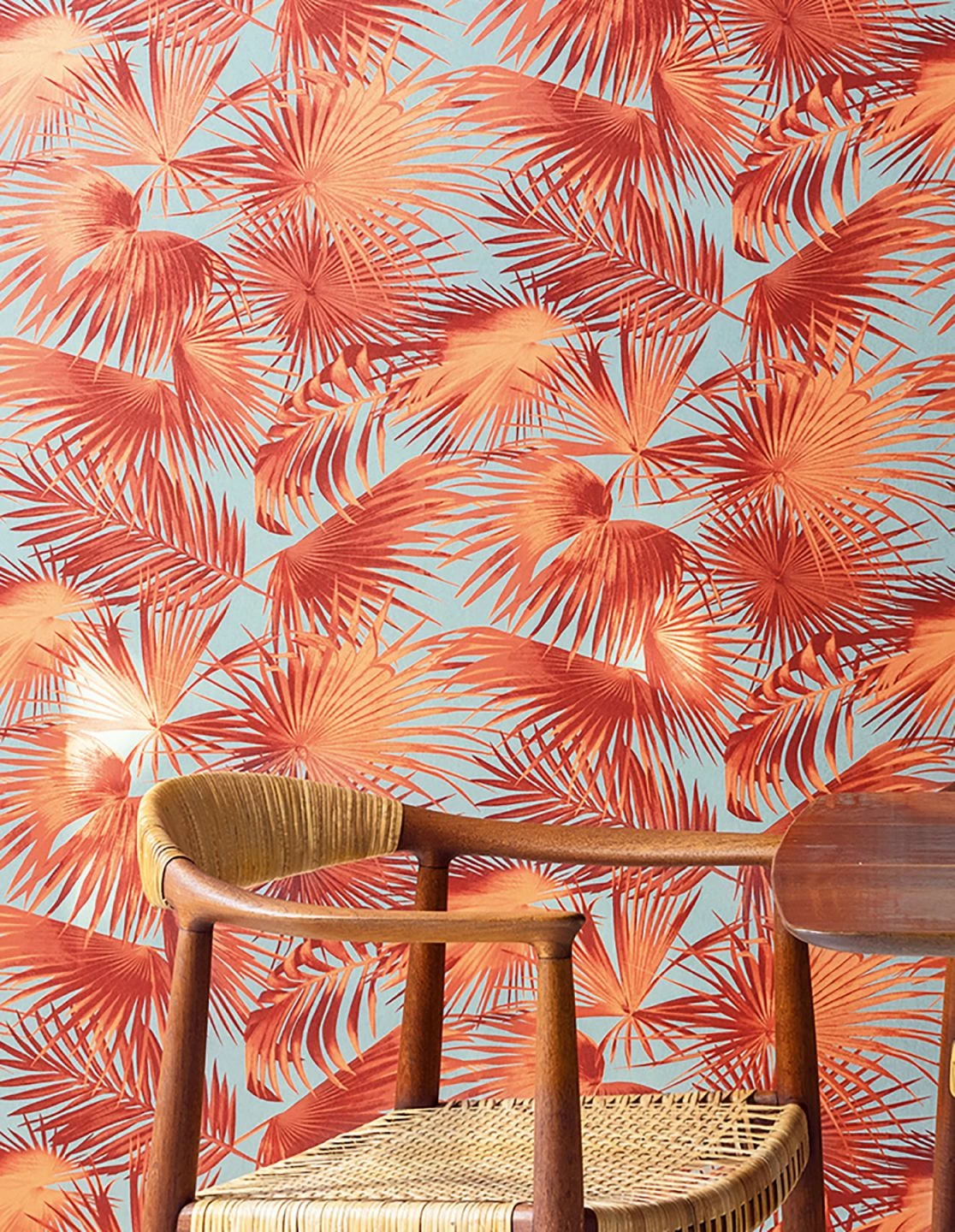 Geballte, scheinbar endlose Energie versprühen die Palmwedel im leuchtenden Musterfarbenmix Pastellorange, Weinrot und Perlrosa, die sich plastisch vom grauen Tapetenfond abheben. Schweben Sie mit im Universum der unbegrenzten Möglichkeiten, die sich mit Designtapete Konda bieten. Ideal für gesellige und hochaktive Räume oder die außergewöhnliche Badelandschaft.