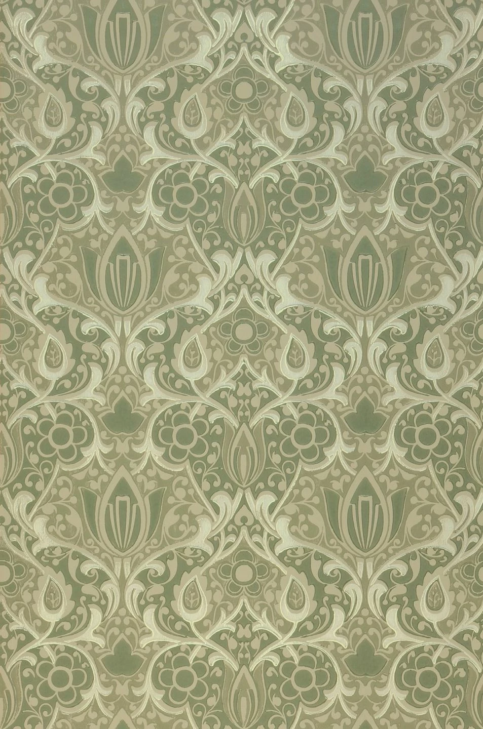 Jeder Millimeter der Papiertapete Lamine ist mit einem komplexen Jugendstil-Muster aus stilisierten Blüten, Ranken und abstrakten Ornamenten ausgefüllt. In der Fülle der verschiedenen Formen bietet der enge Farbraum Ruhe und Zusammenhalt: Gelbgrau, Olivgrün und Grünweiß auf dem grauolivfarbenen Grund verleihen der Leimdruck-Papiertapete einen nostalgischen Touch. Ein gemütliches Wohn- oder Schlafzimmer mit Retro-Möbeln gewinnt mit Lamine an Charakter.