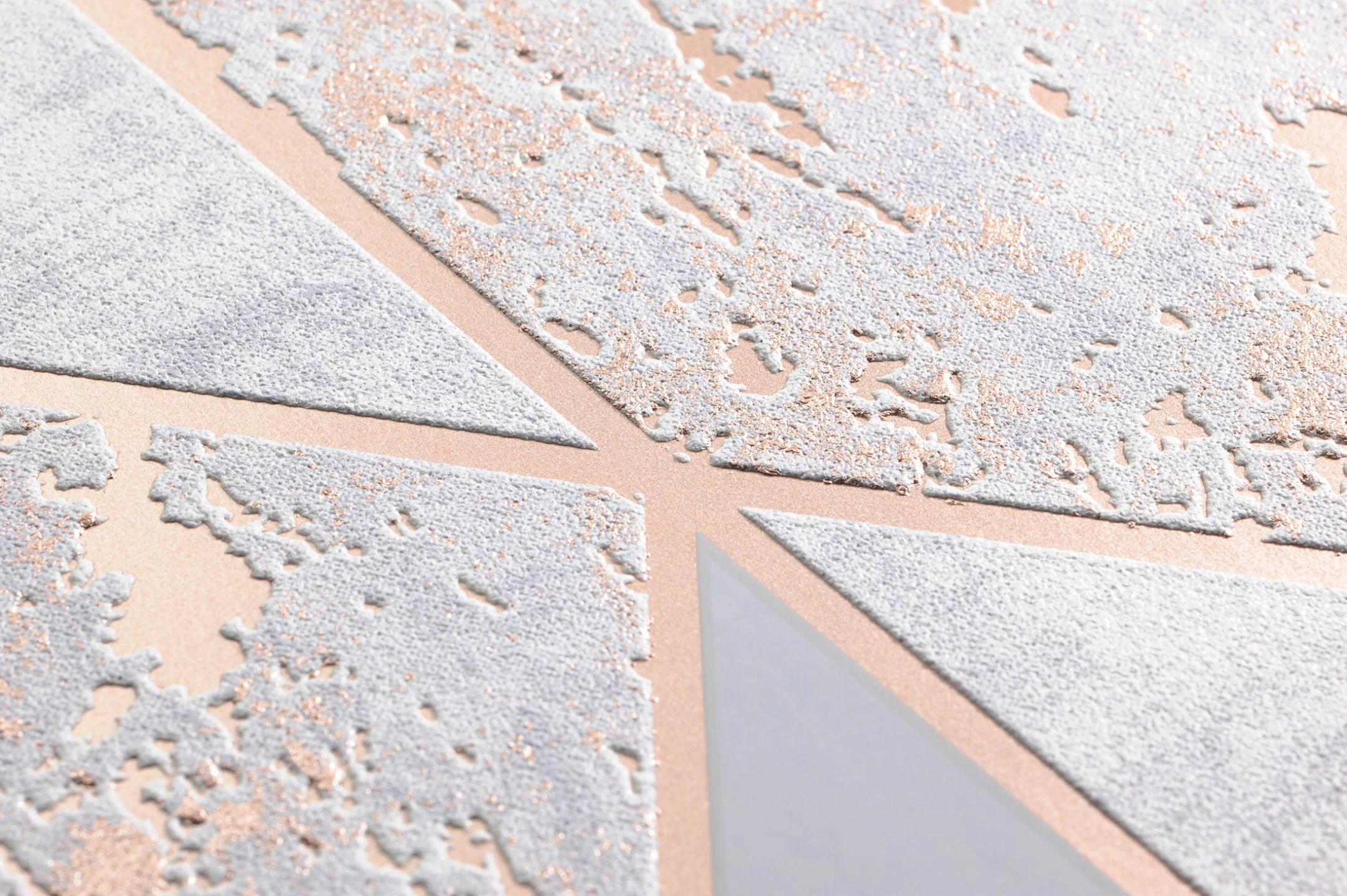 Modernes Art Deco entdeckt sich mit dieser geometrischen Tapete in Grautönen und Rosenholz neu. Der schimmernde Untergrund verhilft dem bewegten dreidimensionalen Muster zu mondäner Eleganz, die sich auch in den marmorierten Flächen widerspiegelt. Das fühlbare Relief der Vinyltapete unterstreicht den hochwertigen Charme.