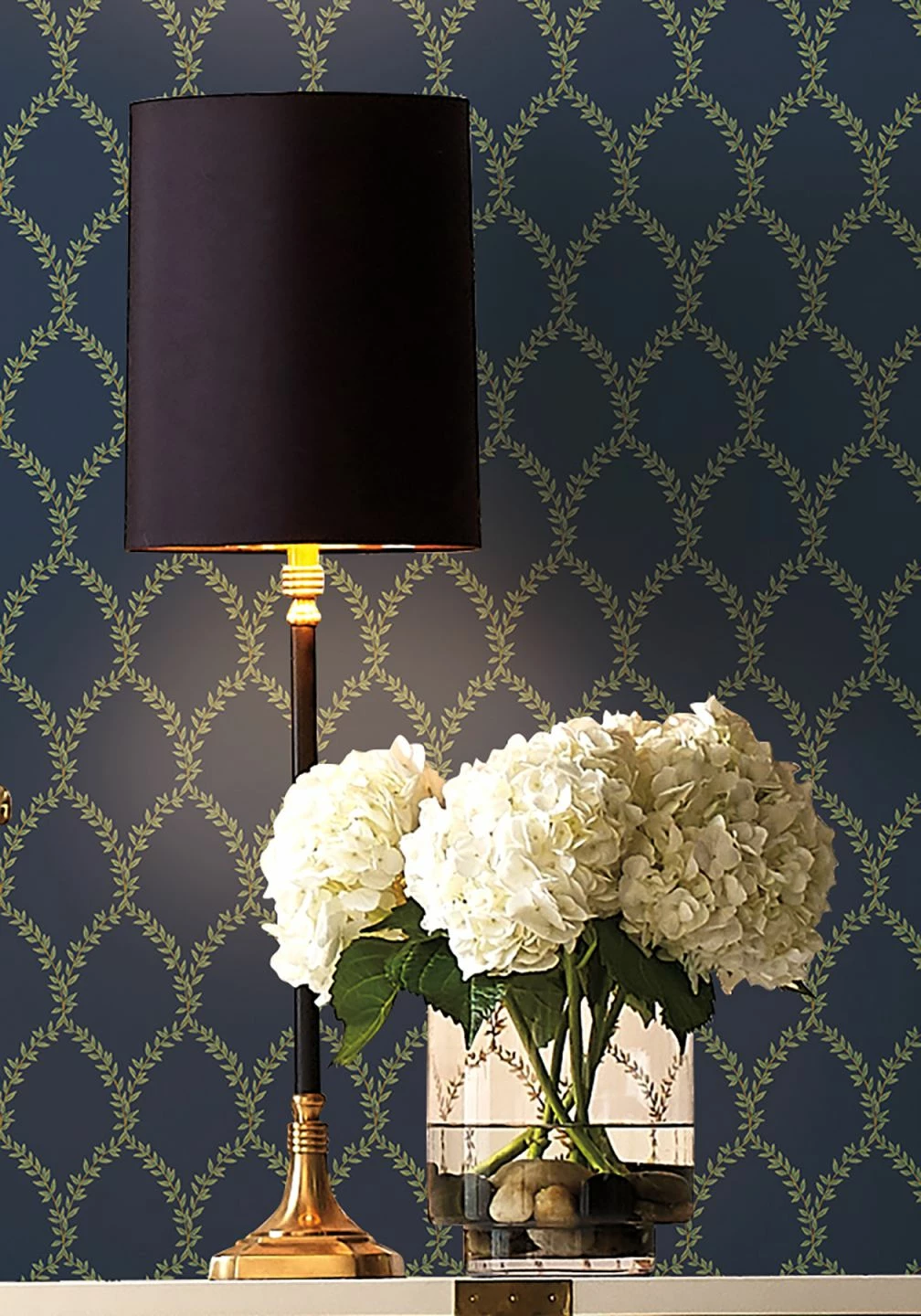Kränze aus feinen Blättern und Zweigen finden sich zu einem zarten Muster zusammen und geben der Vliestapete ihre Struktur. Das dunkle Blau des Untergrunds strahlt Ruhe aus und bildet den perfekten Hintergrund für die perlgoldenen Highlights der Blattkränze. Edel und hochwertig ist die Wirkung dieser Tapete.