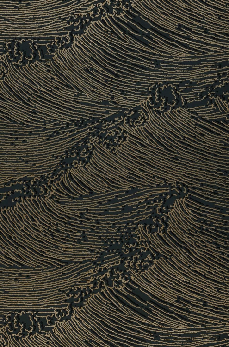 Wellen ganz aus goldenen und schwarzen Linien und Punkten auf dunklem Anthrazit erwecken den Eindruck des vom Wind bewegten Ozeans in der Dunkelheit der Nacht, in der nur das Licht des Mondes für Reflexe sorgt. Das Auf und Ab der Wellen, die wie ein Kupferstich wirken, erinnert an klassische asiatische Kunst und verleiht Ihrem Raum ein kostbares Angesicht. Der geschickte Einsatz von Licht – ob von Fenstern oder aus künstlichen Lichtquellen – erweckt die Goldfarbe der Wellen zum Leben.