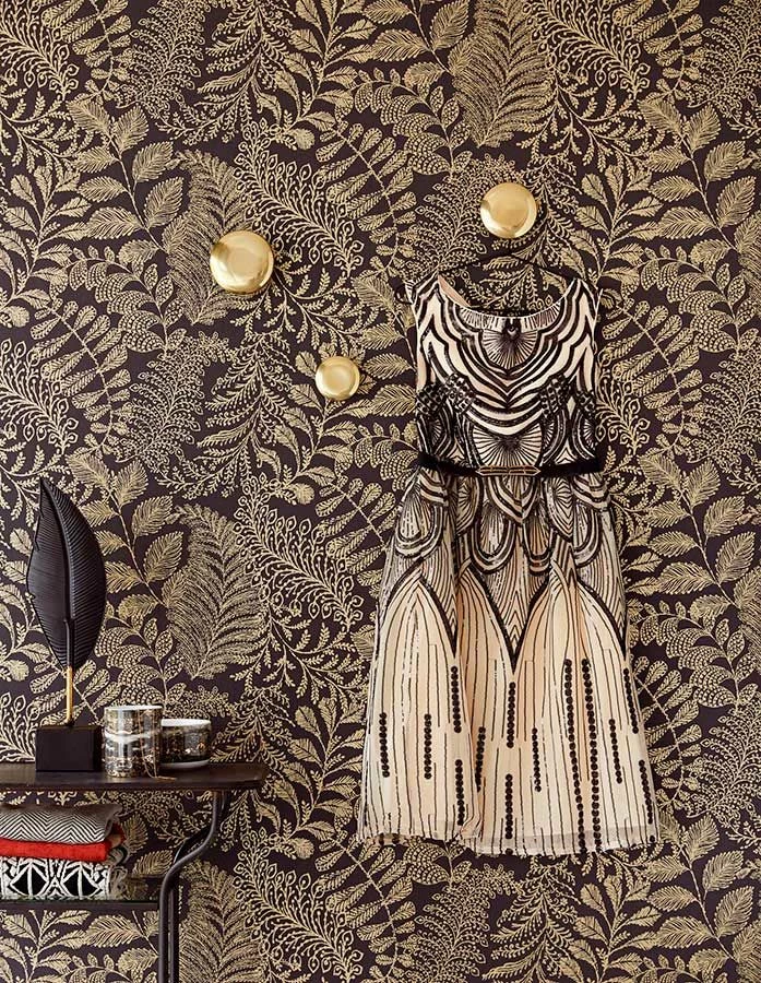 Der Jugendstil war meisterliches Vorbild dieser eindrucksvollen Blattornamentik, die ihre geschwungenen Formen wie selbstverständlich miteinander vernetzt. Mit mattem Anthrazit als Grundfarbe und filigran gezeichneten Blättern in schimmerndem Perlgold entfaltet sich zugleich eine mondäne Opulenz im Raum.