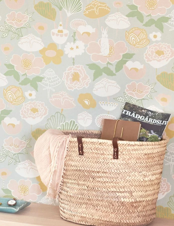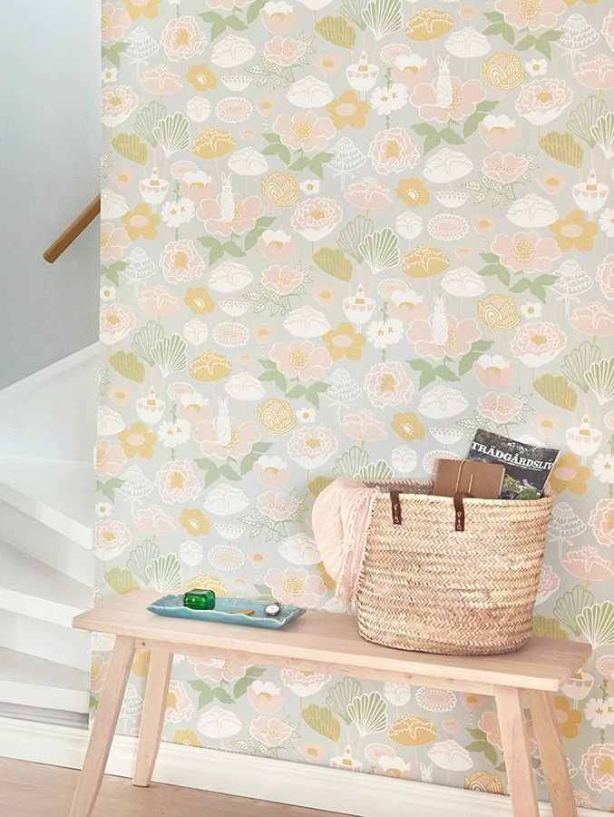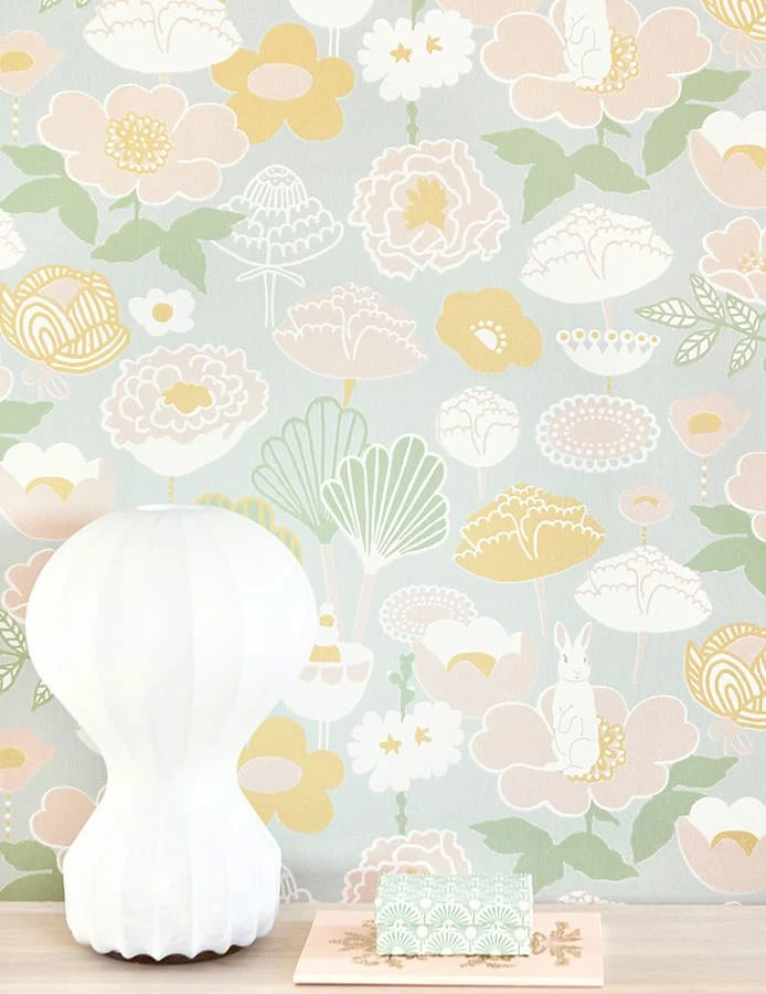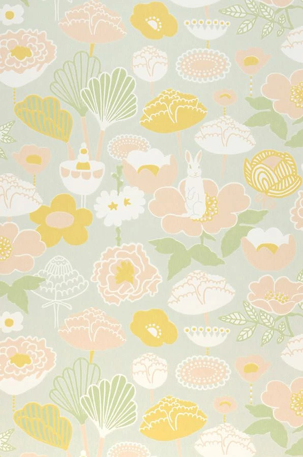 Stolze Hasen und fantasievolle Blumen in pudrig sanften Farben entsenden Sie in das Schlaraffenland der süßen Versuchung. Die Romantik-Tapete Little Light mit kunstvoll grafischem Design zeichnet den Raum wunderbar weich durch die Musterfarben Beigerot, Cremeweiss, Ginstergelb, Maigrün auf hellgrauem Grund.