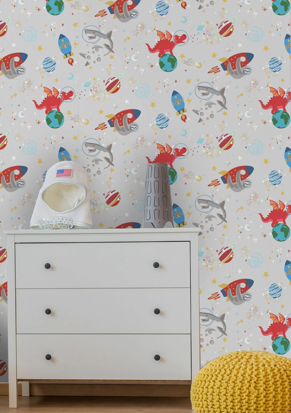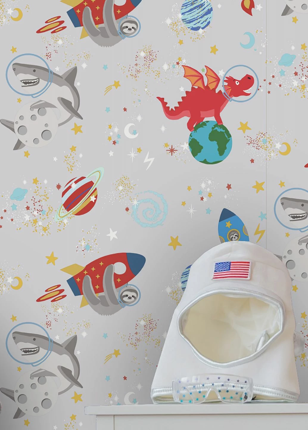 Drachen, Haifische und Pandabären haben sich in die Galaxie verirrt und spielen mit den Planeten oder nutzen Raketen für die Fortbewegung im Universum. Du kannst Dich ihnen anschließen und Abenteuer im Weltall erleben. Herrlich bunte Farben unterstreichen die fantasievolle Ausstrahlung.