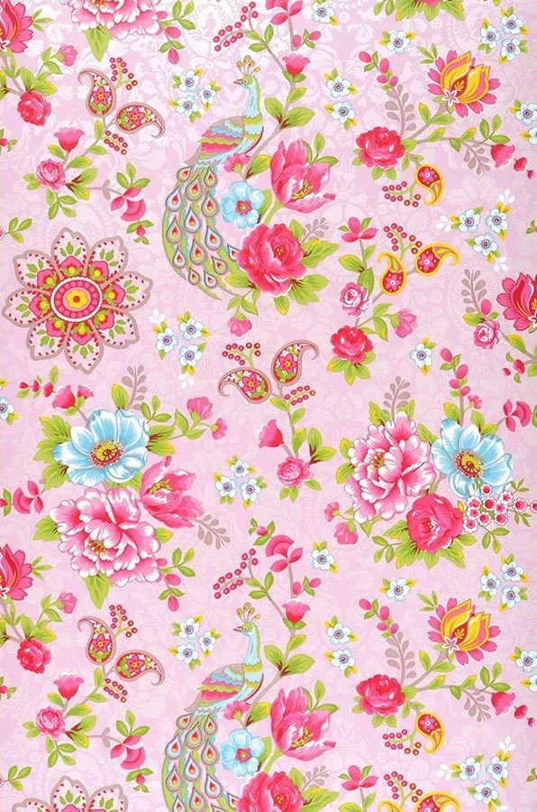 Erlesene Blumenarrangements, dazwischen prachtvolle Pfauen, das zeugt von erlesenem Geschmack. Rosa überzeugt hier als Grundfarbe dieser beliebten floralen Tapete.
