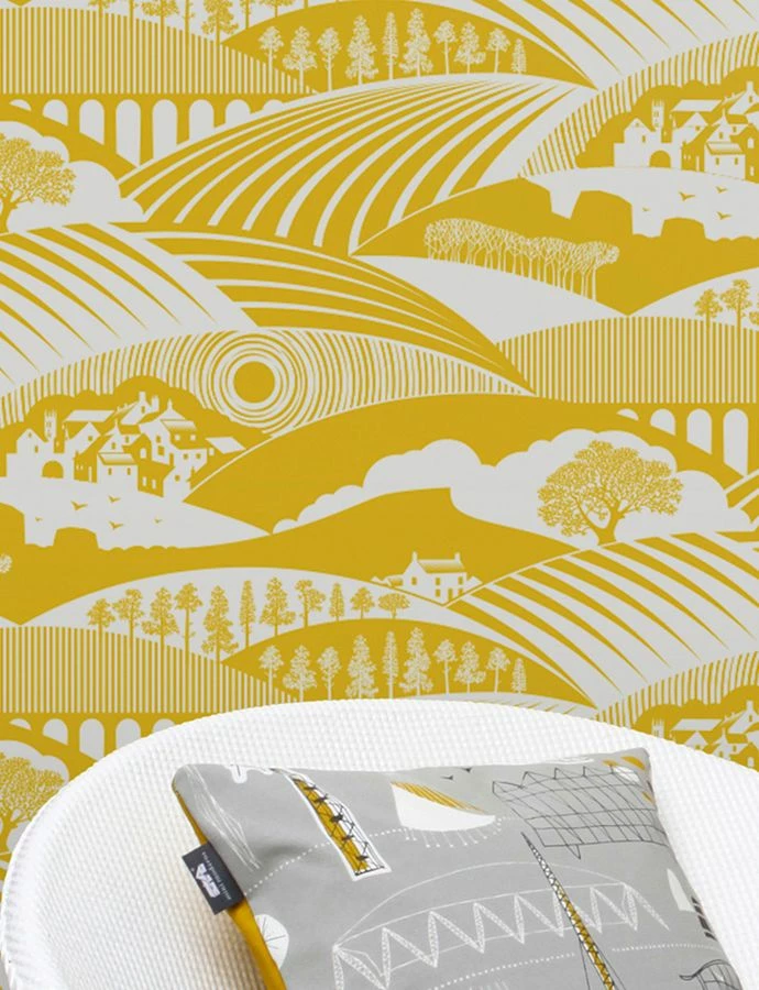 Gelb ist Sonnenschein, Energie Lebenslust. Das landschaftliche Mustermotiv der Romantik Tapete bedient sich unterschiedlicher geometrischer Formen und Strukturen. Das Ergebnis hält den Geist wach und aktiv, nimmt mit auf eine Wellenreise über Berge und Täler mit einer reichen Aussichtsvielfalt. Grauweiß und Zitronengelb garantieren ein intensives Farberlebnis.