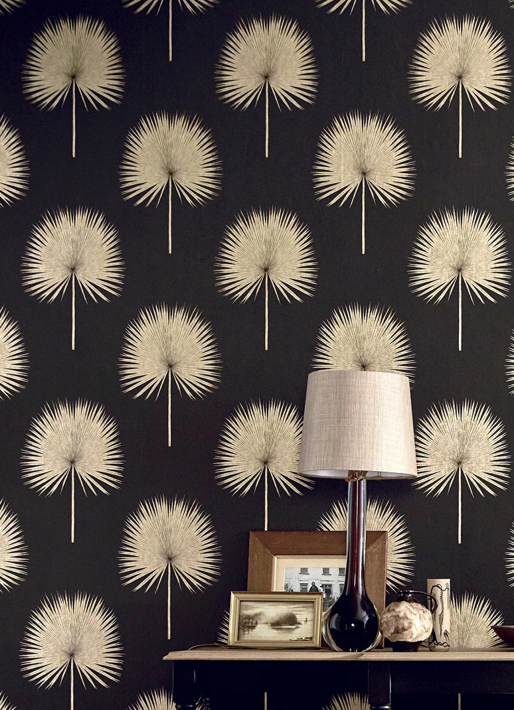 Stilisierte Palmenzweige in Mattgold auf Schwarzgrau definieren ein neues Naturraumgefühl, das vom schimmernden Muster ebenso lebt wie von der Präzision der Stilblüten. Der grüne Raum muss nicht immer bildlich grün sein, er kann auch eine mondäne Form annehmen, wie die glamouröse Designtapete beweist.