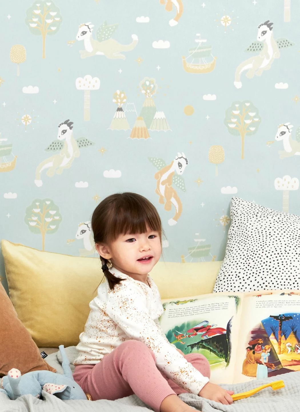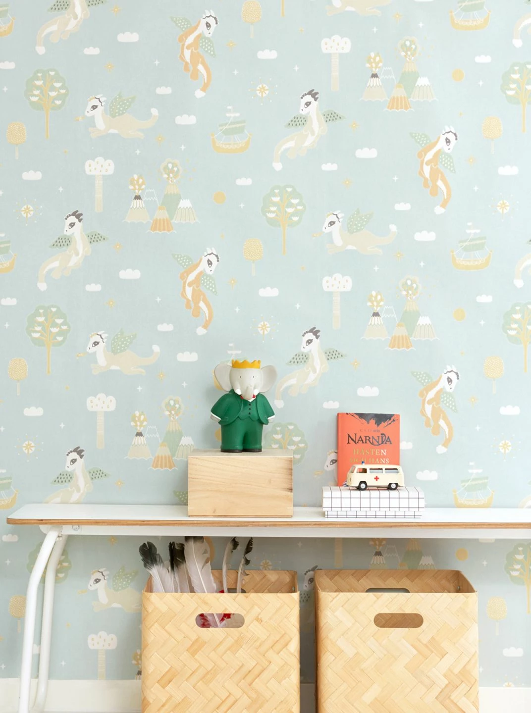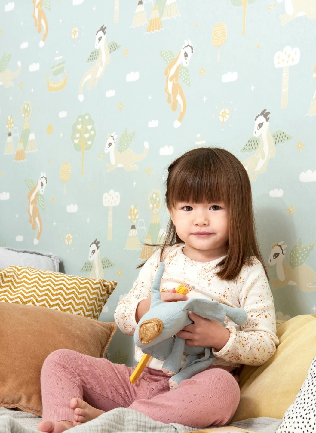 Zwischen den freundlichen geflügelten Drachen und der nur angedeuteten Landschaft aus Bäumen, Wolken, Schiffen und Vulkanen kann sich die Vorstellungskraft Ihres Kindes entfalten. Die im Leimdruckverfahren hergestellte Kindertapete aus dem Hause Majvillan verwandelt das Kinderzimmer in ein Abenteuerland, in dem alles möglich scheint. Die zarten Farben auf dem Untergrund in Blassminttürkis lassen sich vielfältig kombinieren.