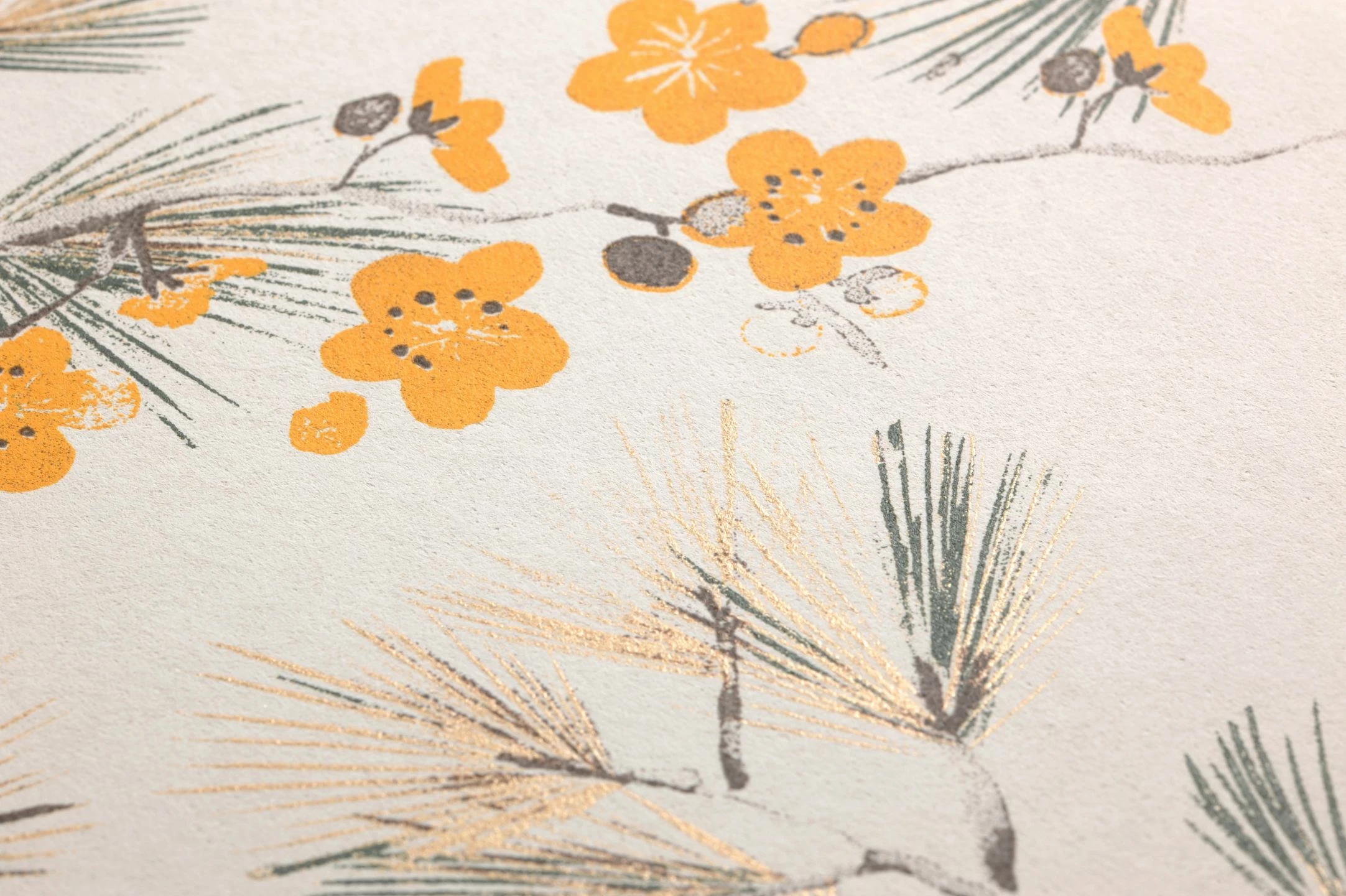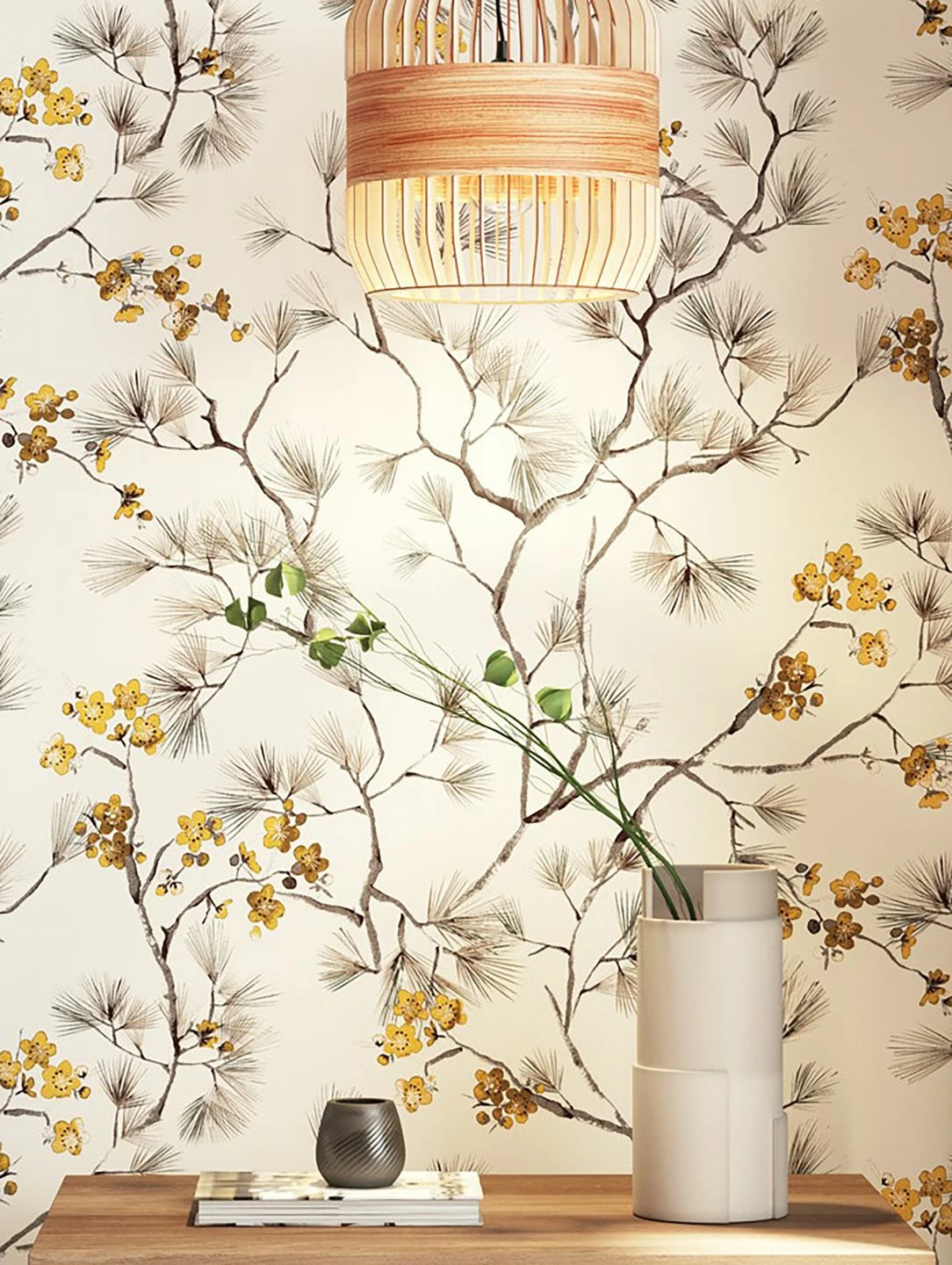 Mit feinen Pinselstrichen gezeichnete Nadelbaumzweige, betont durch leicht schimmernde Glanzlichter von Perlbeige, und leuchtend maisgelbe Blüten auf schlichtem cremeweißem Untergrund kreieren einen Wandschmuck, der perfekt zum klaren asiatischen Einrichtungsstil passt. Die Vliestapete „Makino“ wirkt frisch und leicht und bringt sonniges Leuchten und orientalische Freundlichkeit in Ihren Raum.