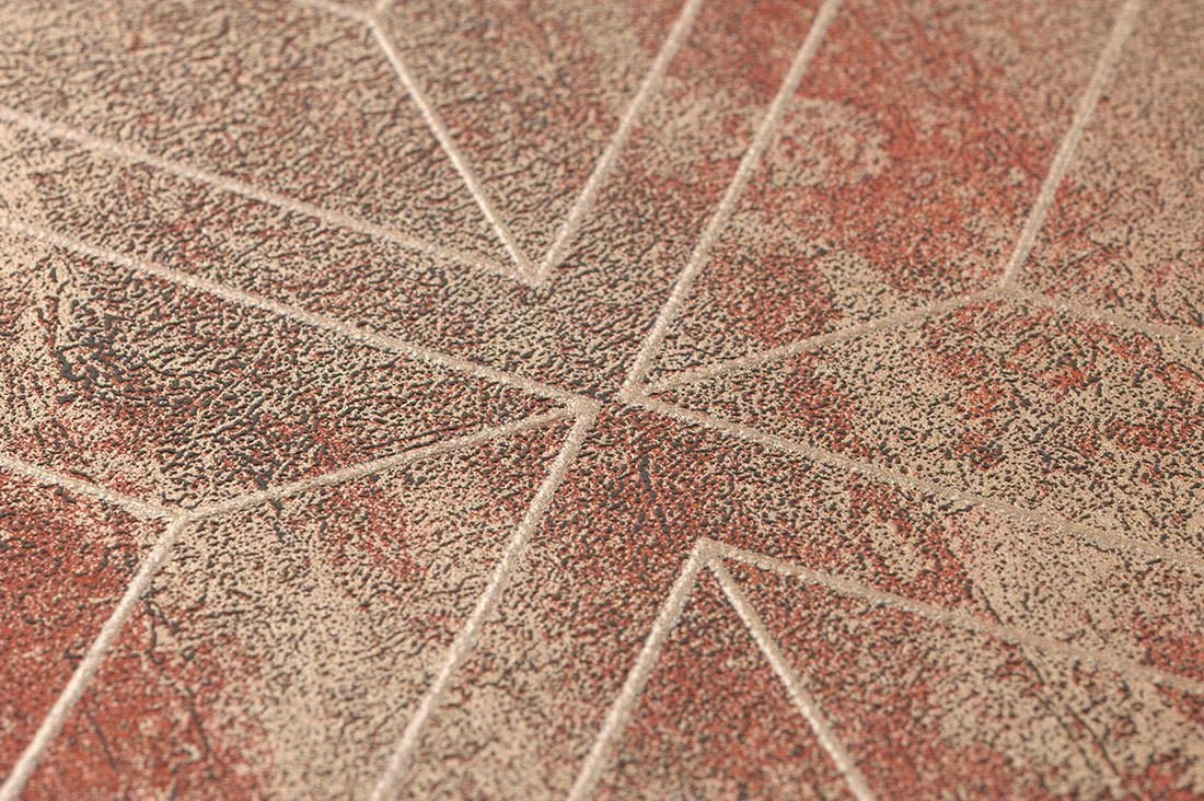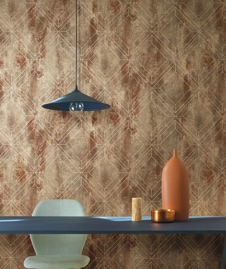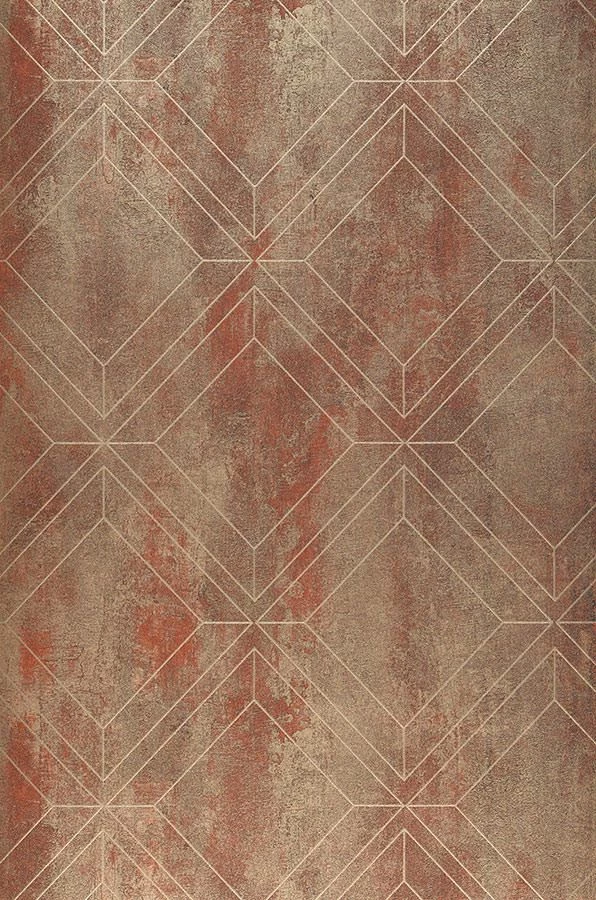 Visuelle Vielschichtigkeit präsentiert Design Geometrie Tapete Malekid in einer Farbkomposition aus Kupferbraun und Mattgold. Rauer Industrial Look mit einer hohen Dynamisierung durch das grafische Rautenmuster verbreitet Loftfeeling im Raum. Von nah und fern betrachtet, ergeben sich bei dieser waschbeständigen Vliestapete mit glatter Oberfläche spannende Momente.