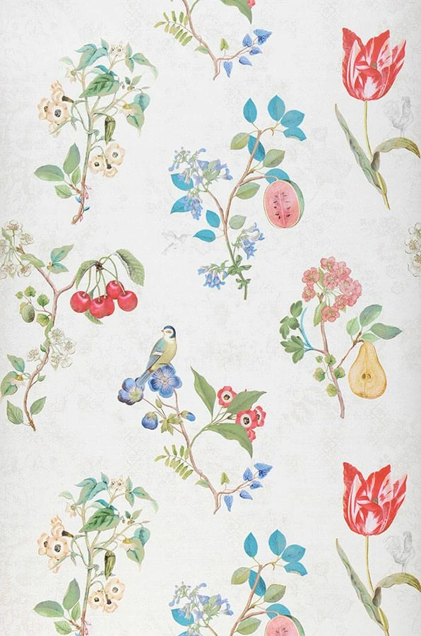 Fruchtig-blumig und mit reizenden Vöglein zeigt sich Design Tapete Mallorie mit cremeweißem Fond. Die Musterfarben in Grün, Rot, Türkisblau, Violettblau schaffen einen satten Kontrast und zaubern beschwingte Farbtupfer in den Raum. Die pflegeleichte Vliestapete bietet Romantik in heller Frische, die besonders attraktiv mit natürlichen Holzmöbeln zur Geltung kommt.