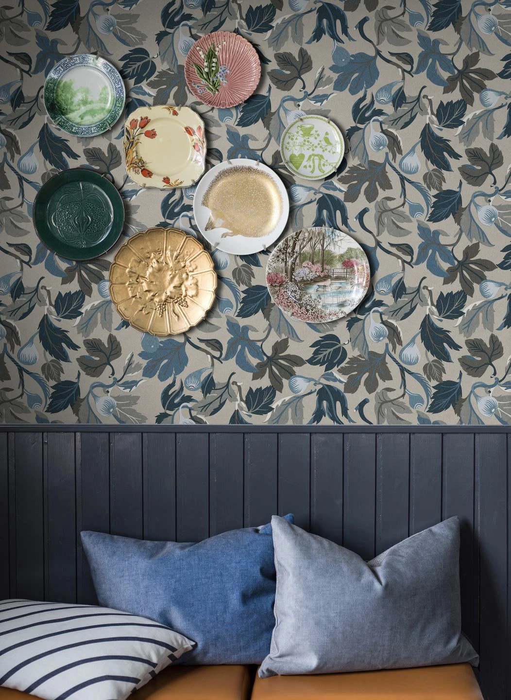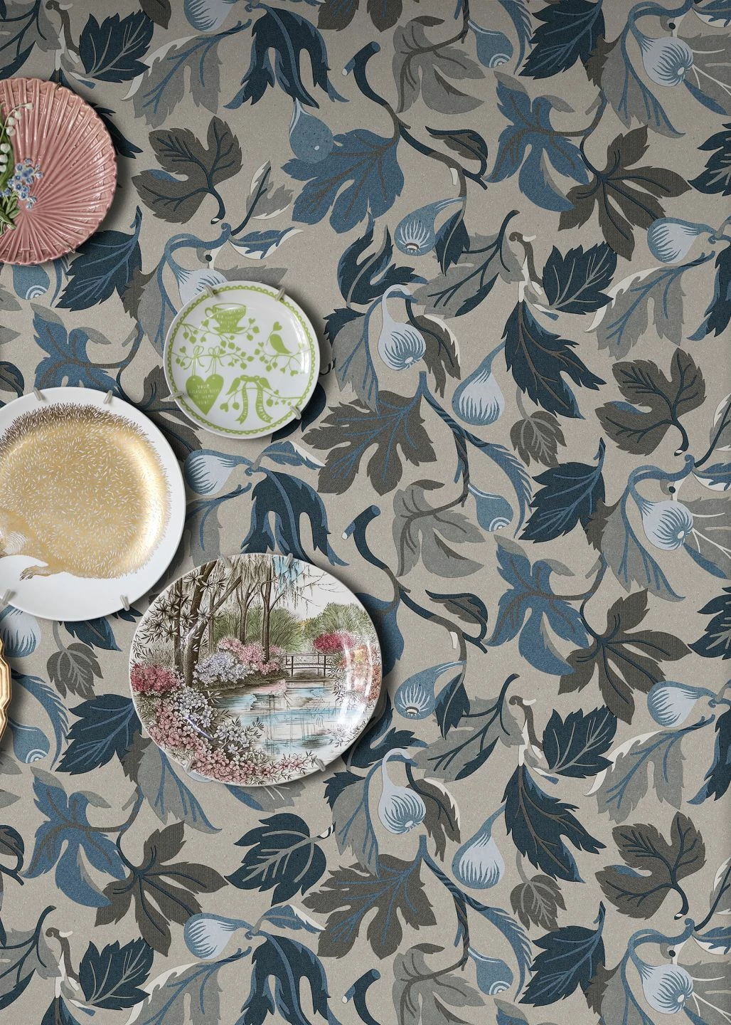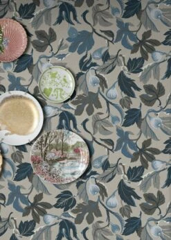 Unwiderstehlich ist die Farbzusammenstellung von Mandolino: Reife Feigen mit dem typischen Laub, alles in Blautönen, Dunkelgrau und Graubraun gehalten, in Verbindung mit dem grauen Grund der Vliestapete – geschmackvoll und stilsicher verschönern Sie so Ihre Küche, Ihr Esszimmer oder Ihr Wohnzimmer. Das moderne botanische Design ergänzt den Landhaus-Stil zur Perfektion und macht Ihre Räumlichkeiten unverwechselbar.