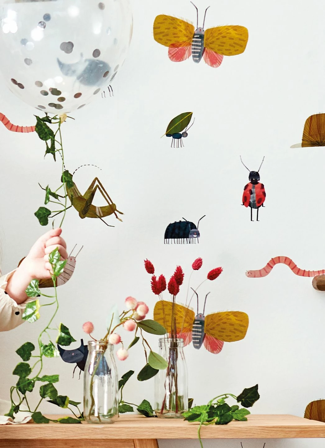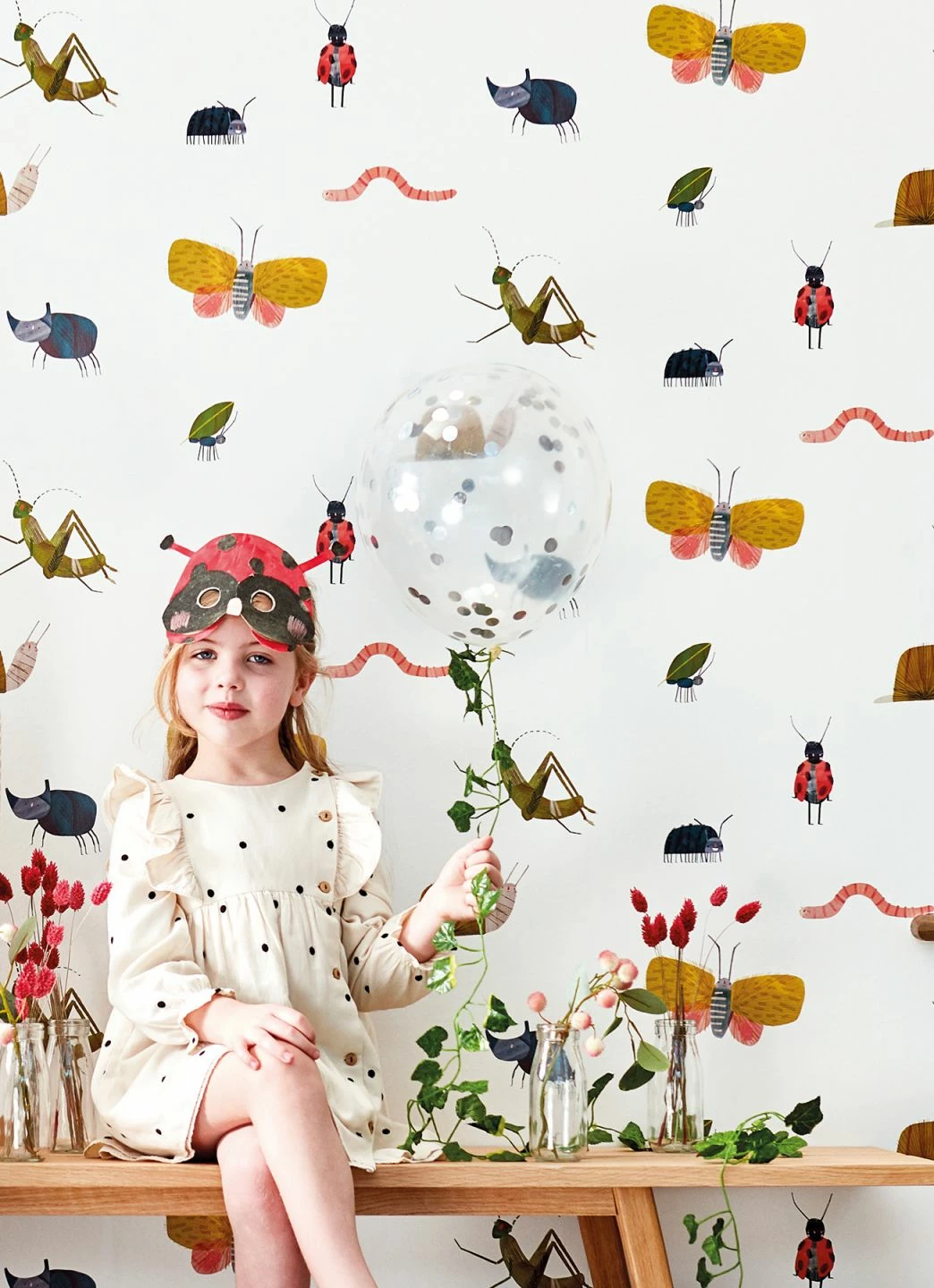 Eine Tapete wie geschaffen für den kleinen Naturforscher oder die kleine Naturforscherin in Ihrer Familie! Hier tummeln sich alle möglichen Insekten und Kriechtiere – Marienkäfer, Schmetterlinge und Grashüpfer, Tausendfüßler, Schnecken und Regenwürmer. Alle sehen aus, als wären sie liebevoll mit Tuschfarben an die Wände gemalt. Hier lassen sich wunderbar die nächsten Expeditionen in die Natur planen!