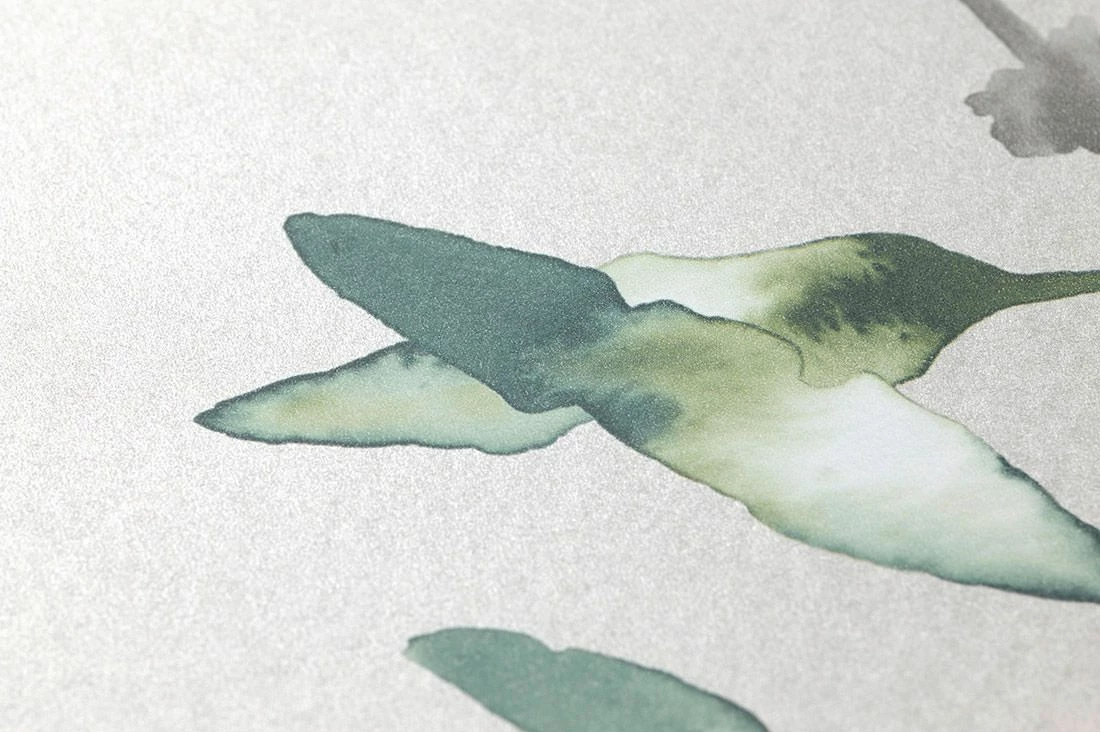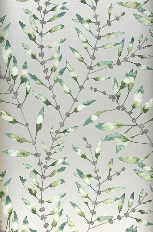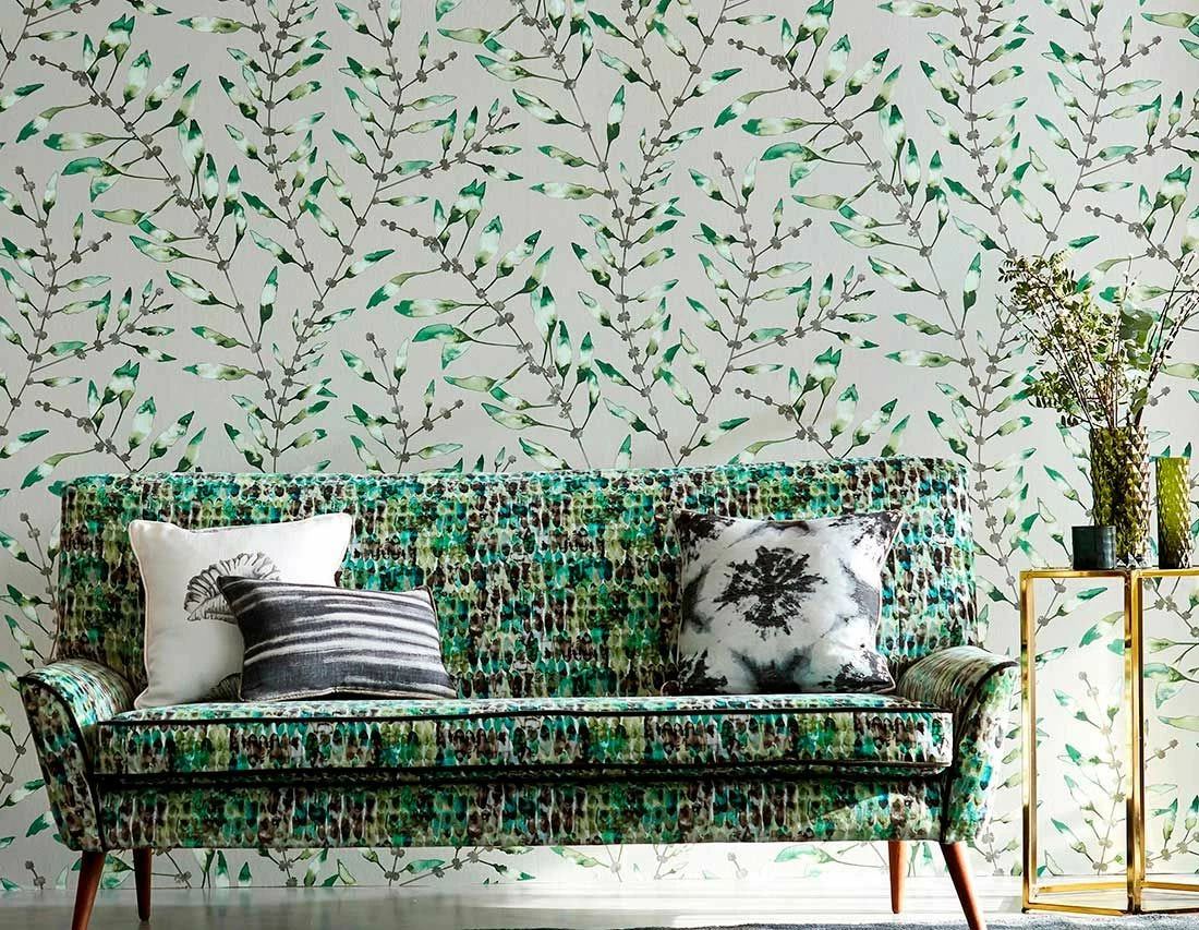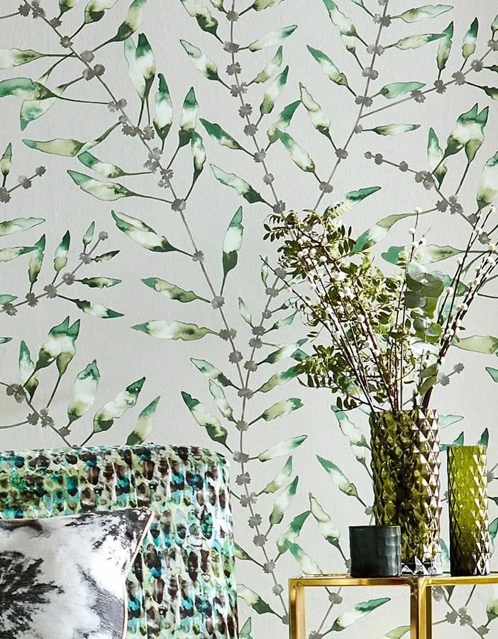 Farbabstufungen, Verläufe, Hell-Dunkel-Kontraste lassen die grünen Blätter an umbragrauen Zweigen auf Design Tapete Mathea täuschend echt erscheinen. Der aluminiumweiße Tapetengrund verleiht das Plus an magischer Tiefe. Lassen Sie sich umgarnen von dieser natürlichen Schönheit, die sich kunstvoll Ihrer Raumgestaltung anpasst.